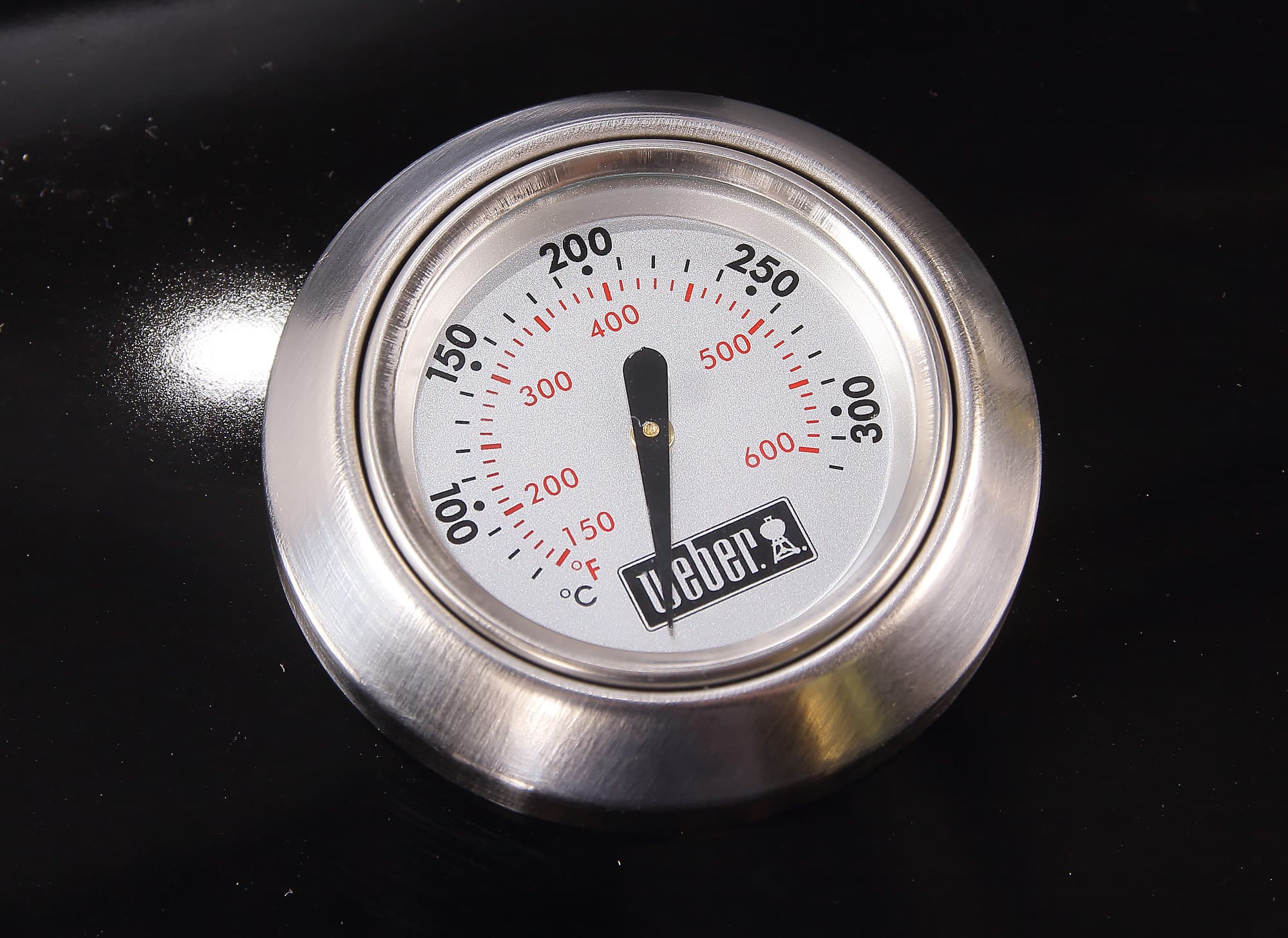В крышку встроен термометр, позволяющий узнавать температуру внутри гриля. Шкала маркирована в градусах Цельсия и Фаренгейта — очень милый элемент адаптации для европейского рынка.
