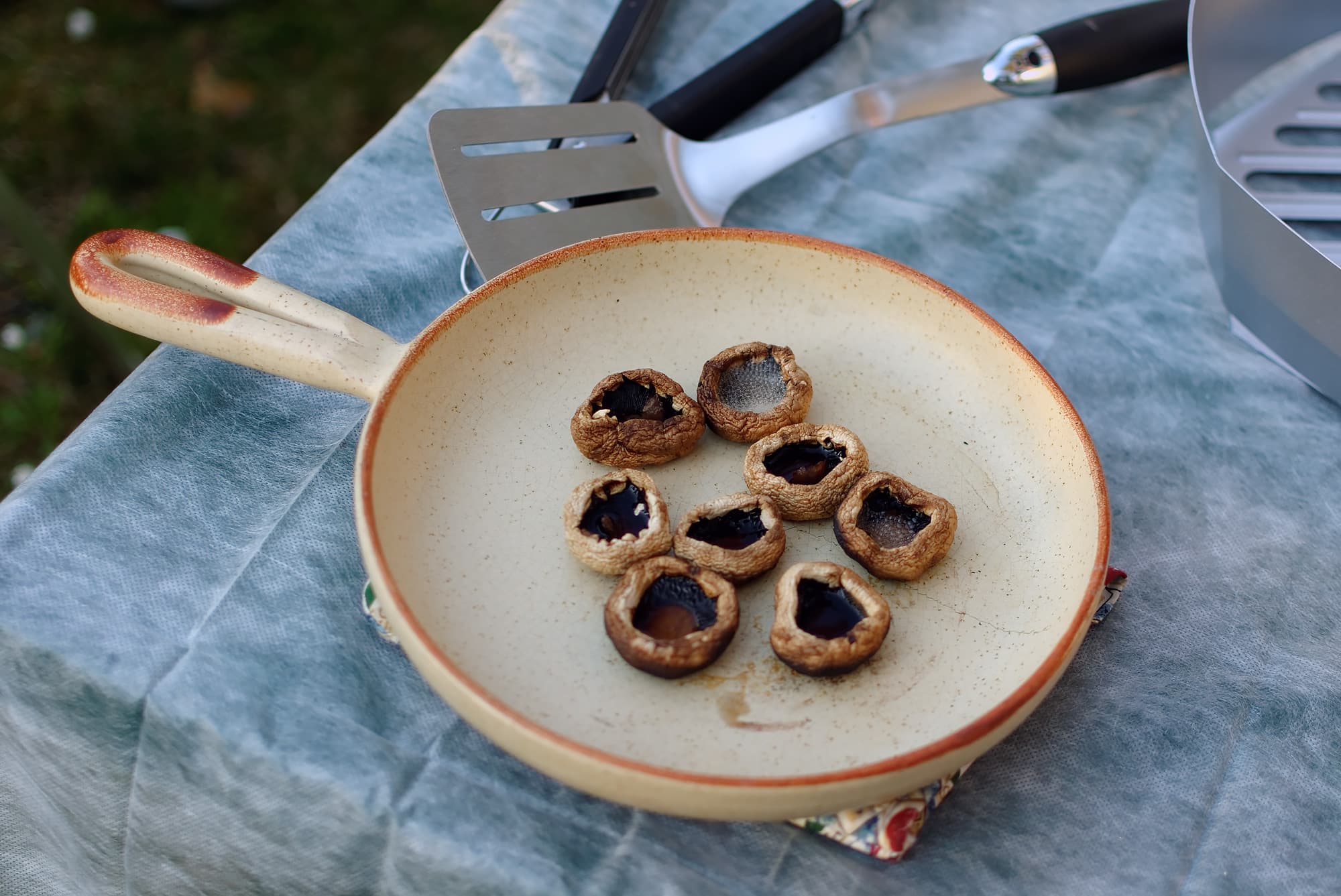 Разложили наши овощи в зоне непрямого жара, разместив угли посередине нижней решетки. В середине в качестве бонуса к списку основных блюд поместили несколько шляпок шампиньонов, закрыли крышкой.