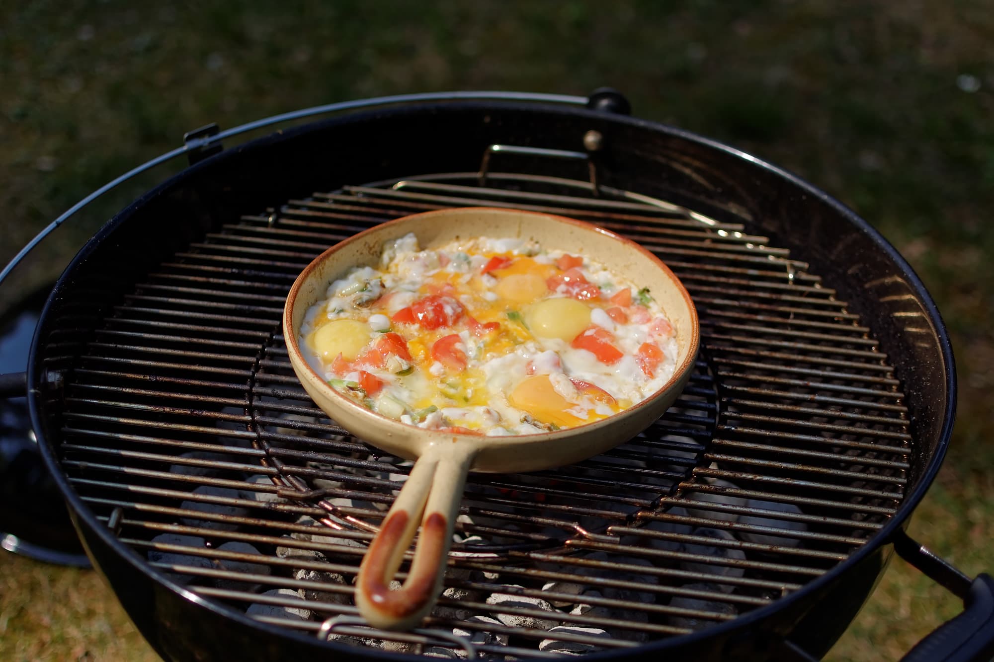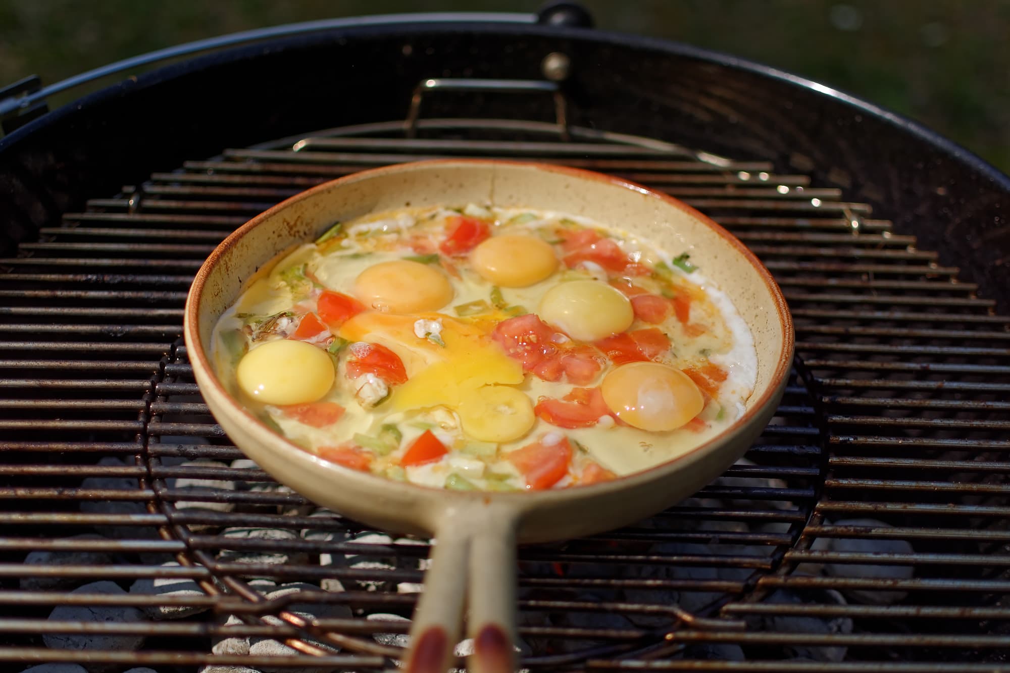 - яичница с помидорами и ветчиной на углях;