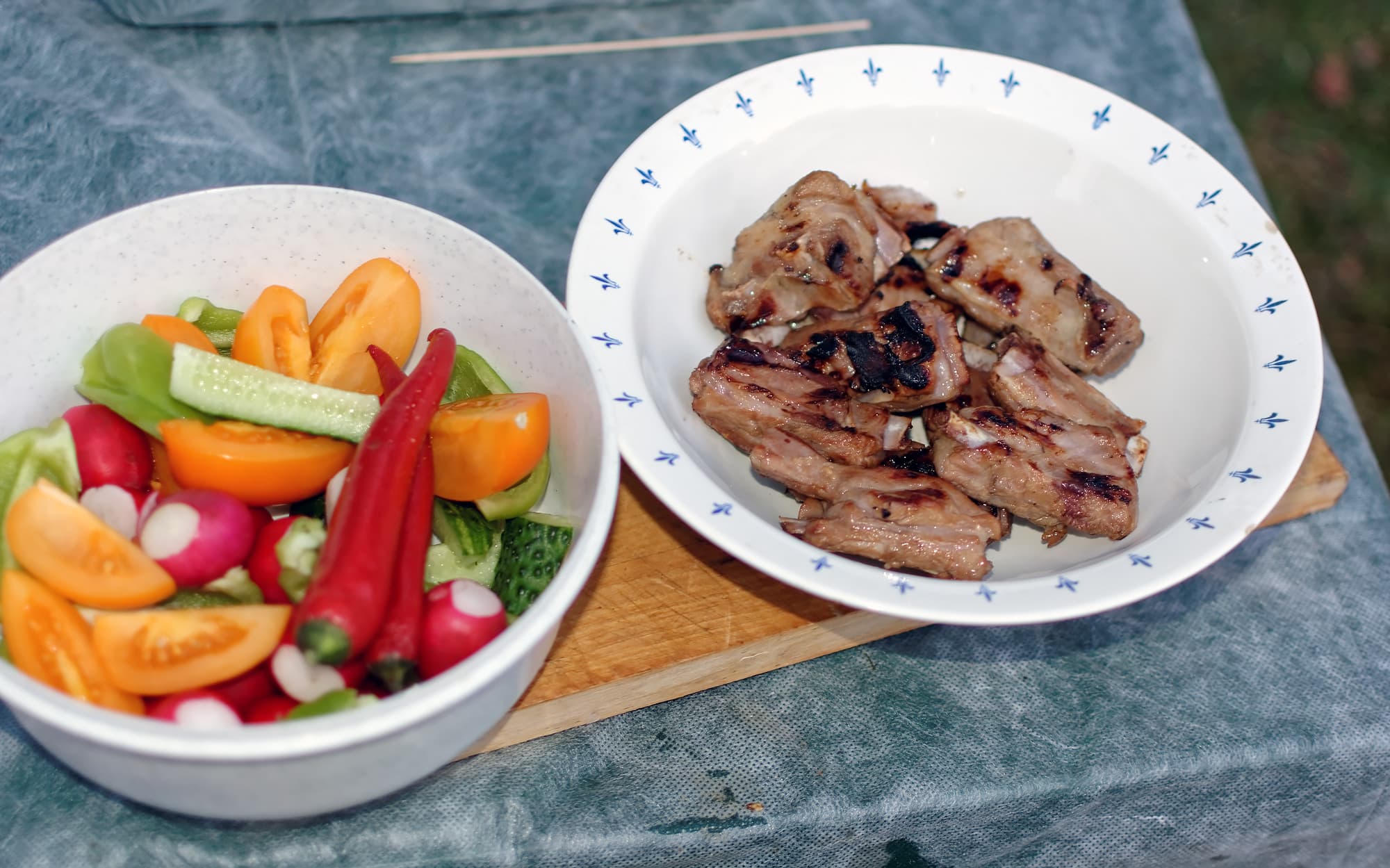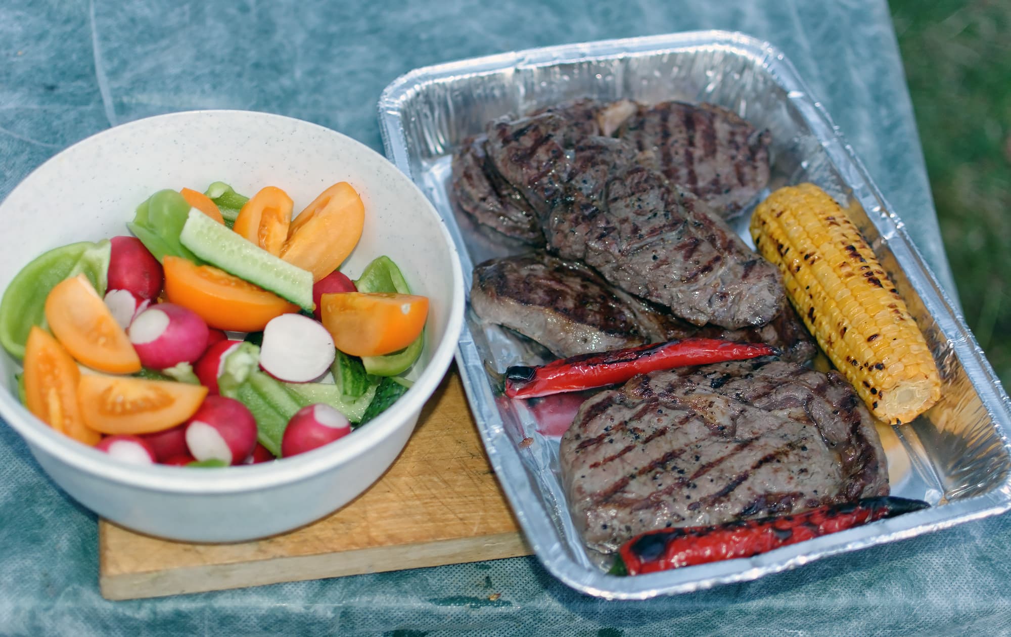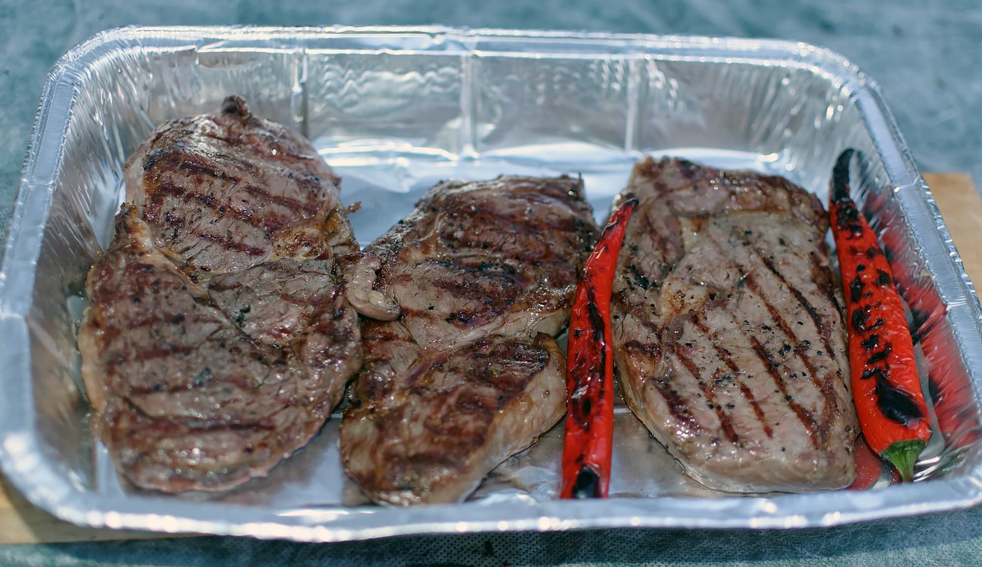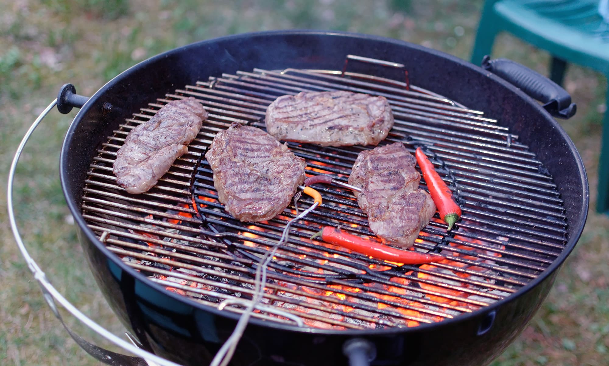 Жарили мясо на непрямом (по возможности, учитывая угли) огне до достижения прожарки medium well и medium rare у тонких и толстых кусков соответственно.