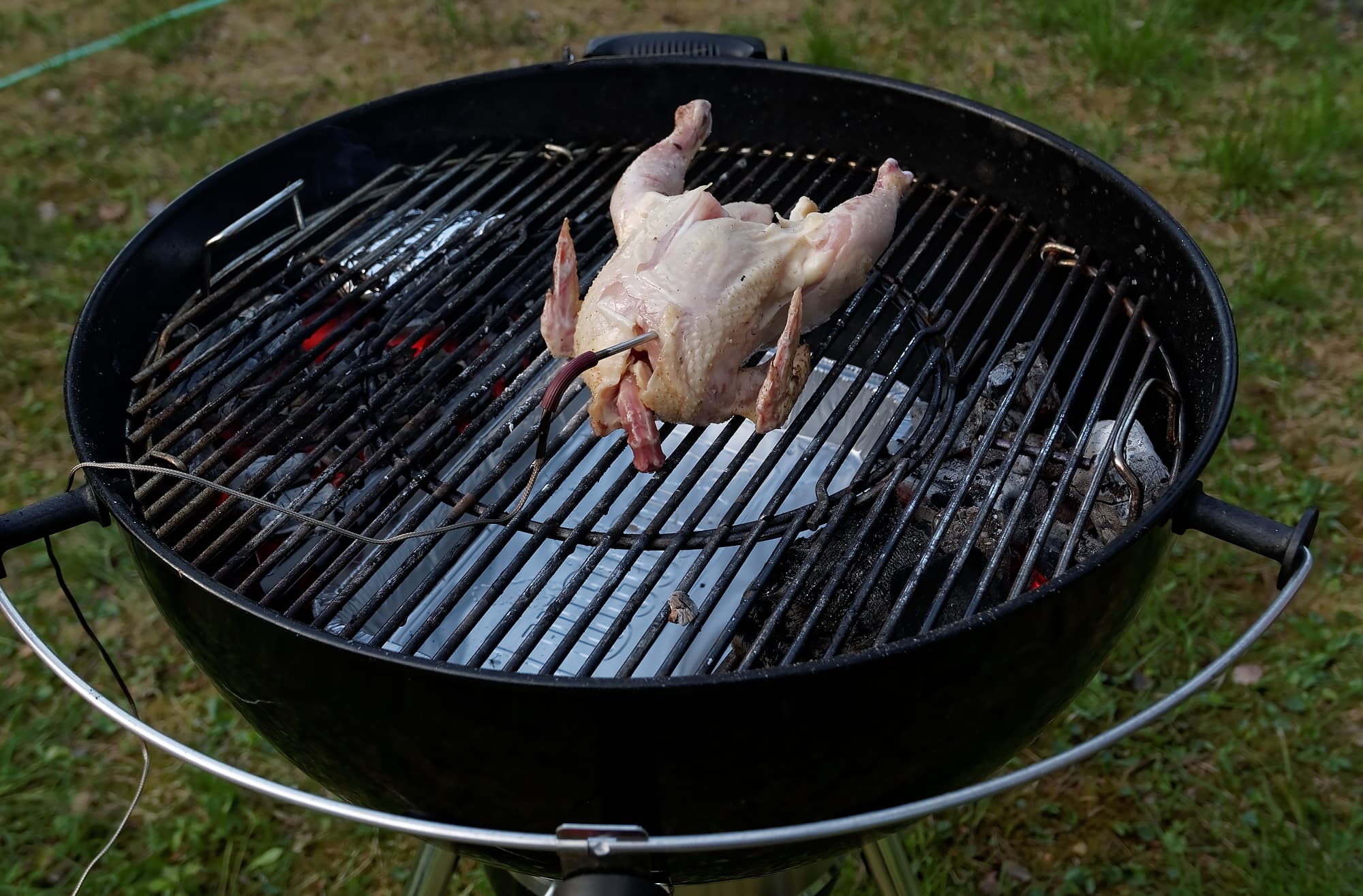 Берем небольшого фермерского цыпленка, солим и укладываем на решетку. Угли в разделителях расположены по бокам нижней решетки, а в середине между ними удобно размещается поддон, который помешает жиру капать в нижнюю часть гриля.