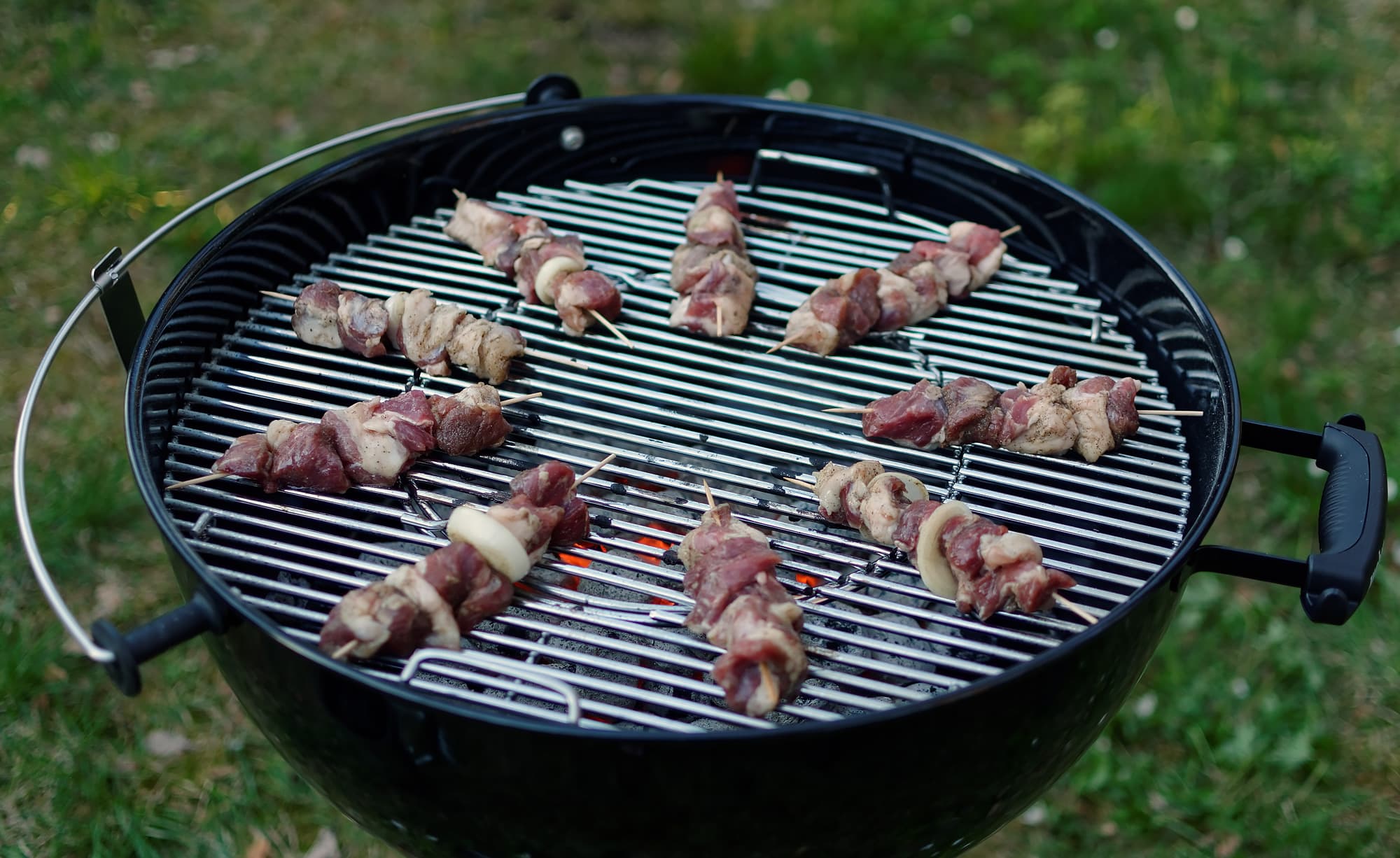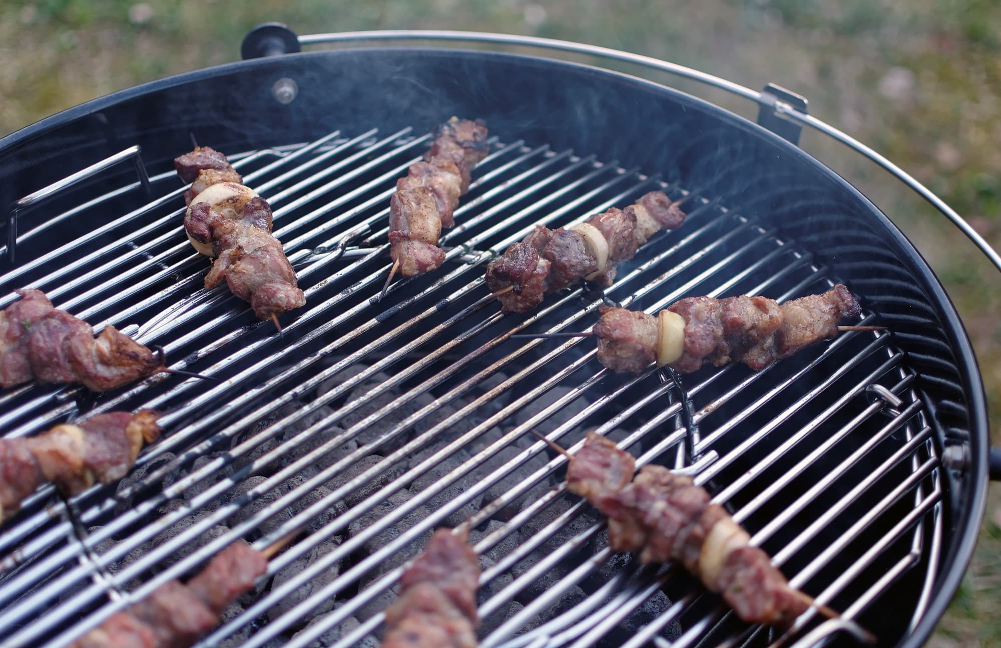 Насадили баранину на тонкие шпажки, которые накануне бросили в воду: опасались, что загорятся. Самый жар от углей у нас посередине, поэтому разложили наши шашлычки веером ближе к краям. Как видите, у нас получилось восемь штук, а гриль без проблем вместил бы еще столько же.