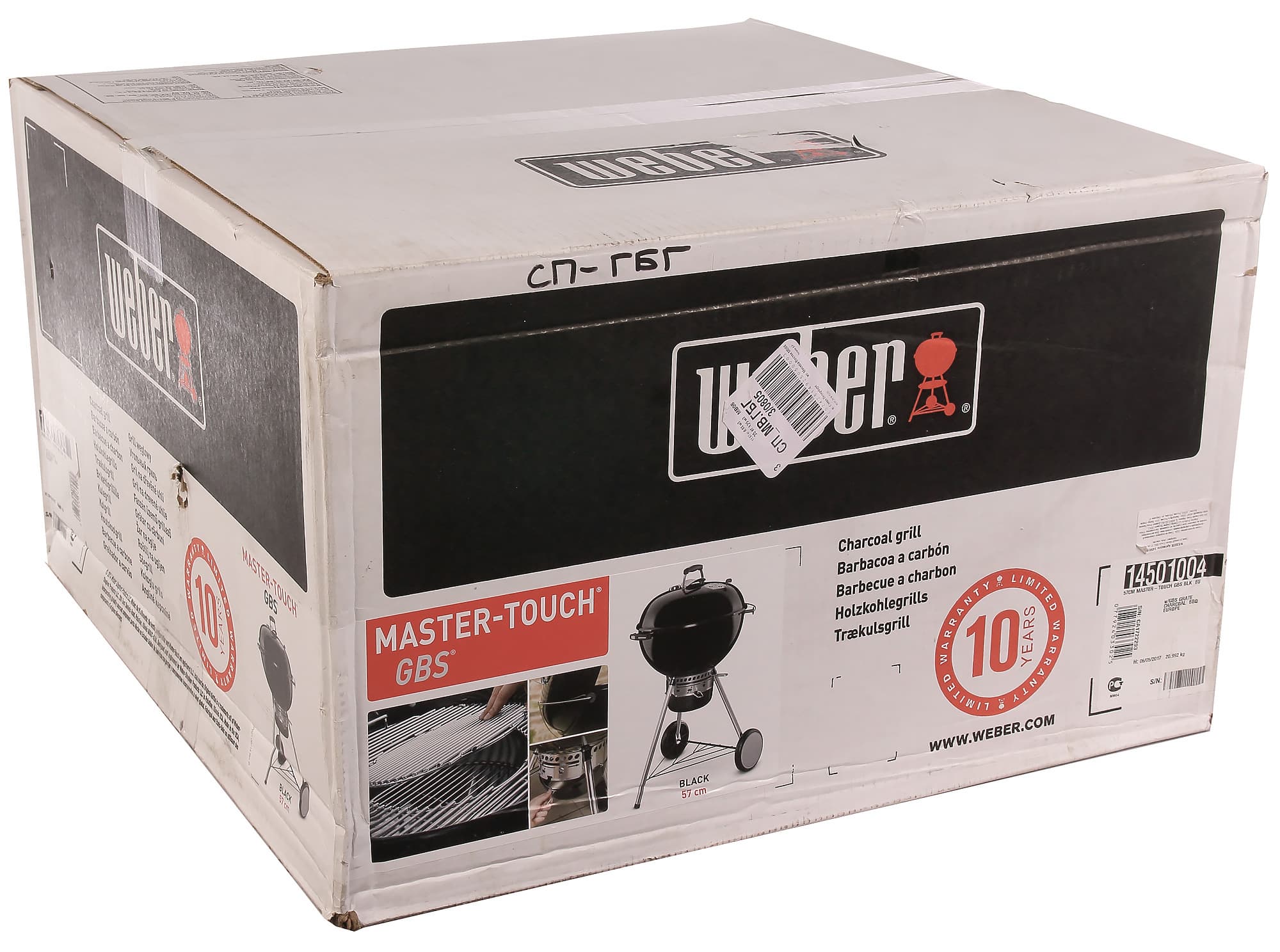 Фирменная упаковка Weber Master-Touch GBS — это огромная и очень тяжелая картонная коробка с наименованием производителя и модели, фото продукта, его краткими характеристиками. К коробке прилагался ящик с аксессуарами и ящик с угольными брикетами.