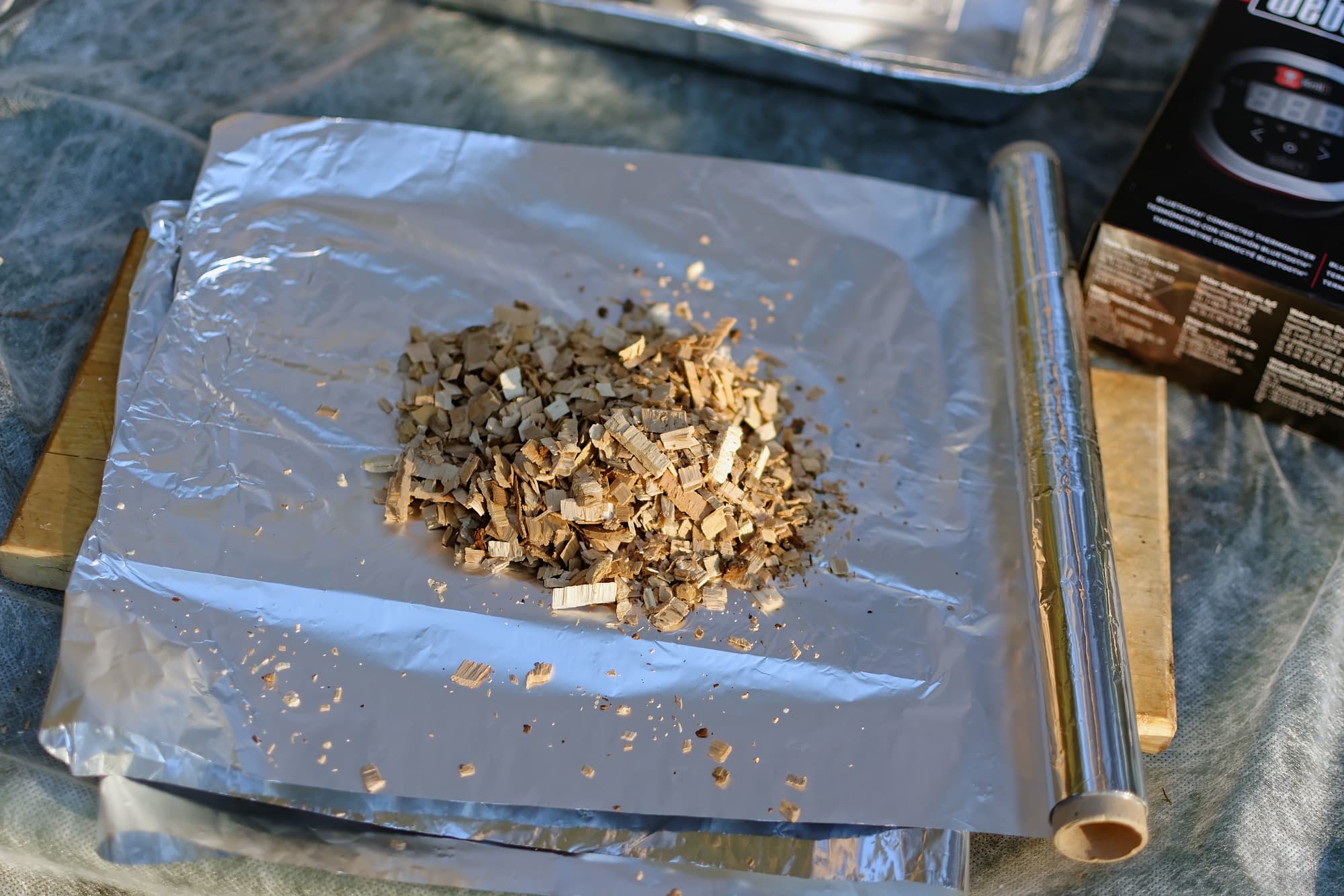 Далее вспомнили, что идея с копчением рыбы показалась нам трудозатратной, изобрели и осуществили инновацию. Для начала насыпали чуть влажноватую щепу в фольгу.