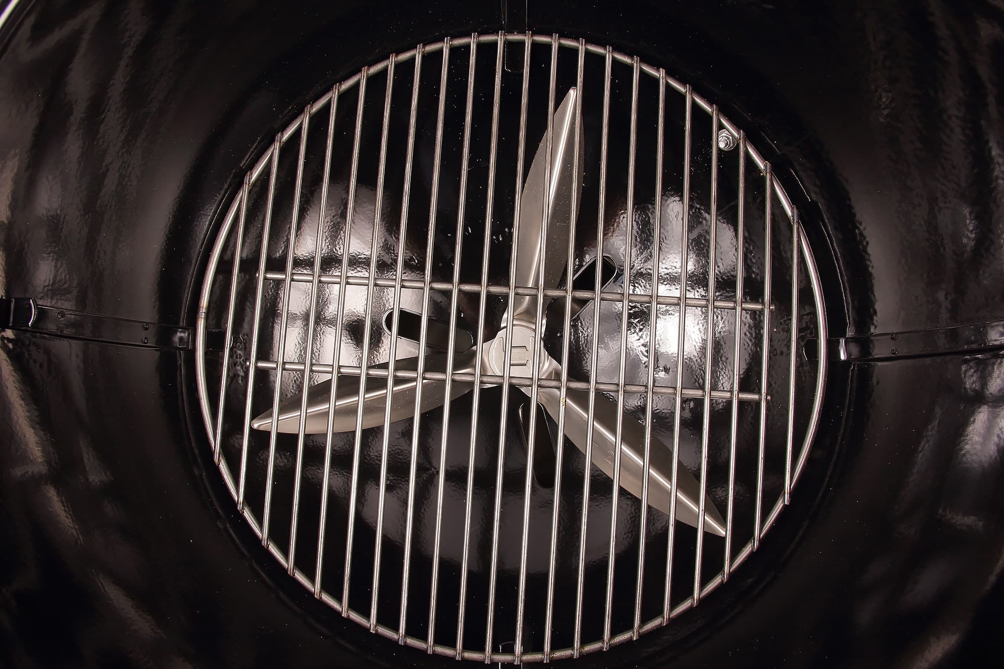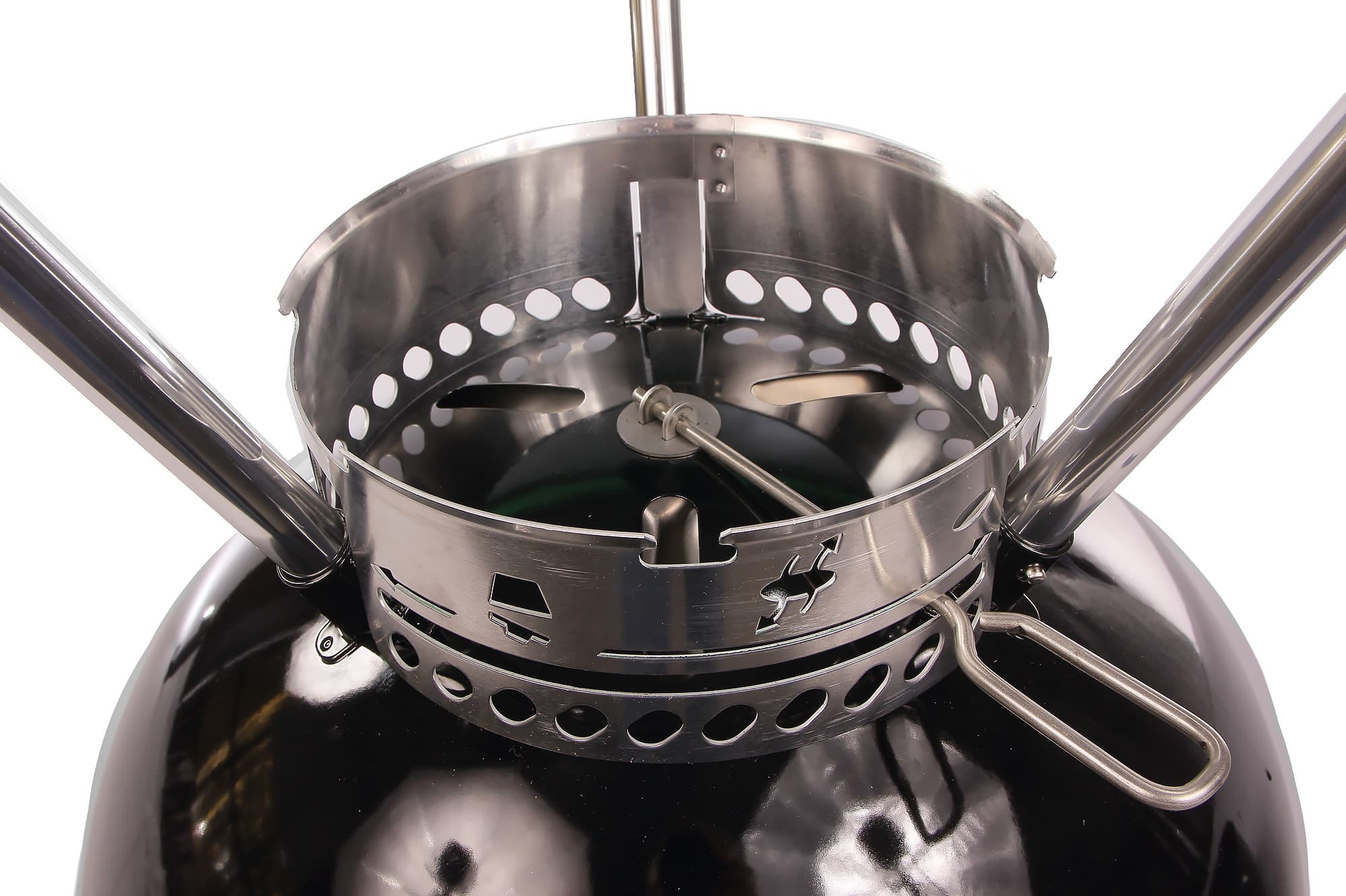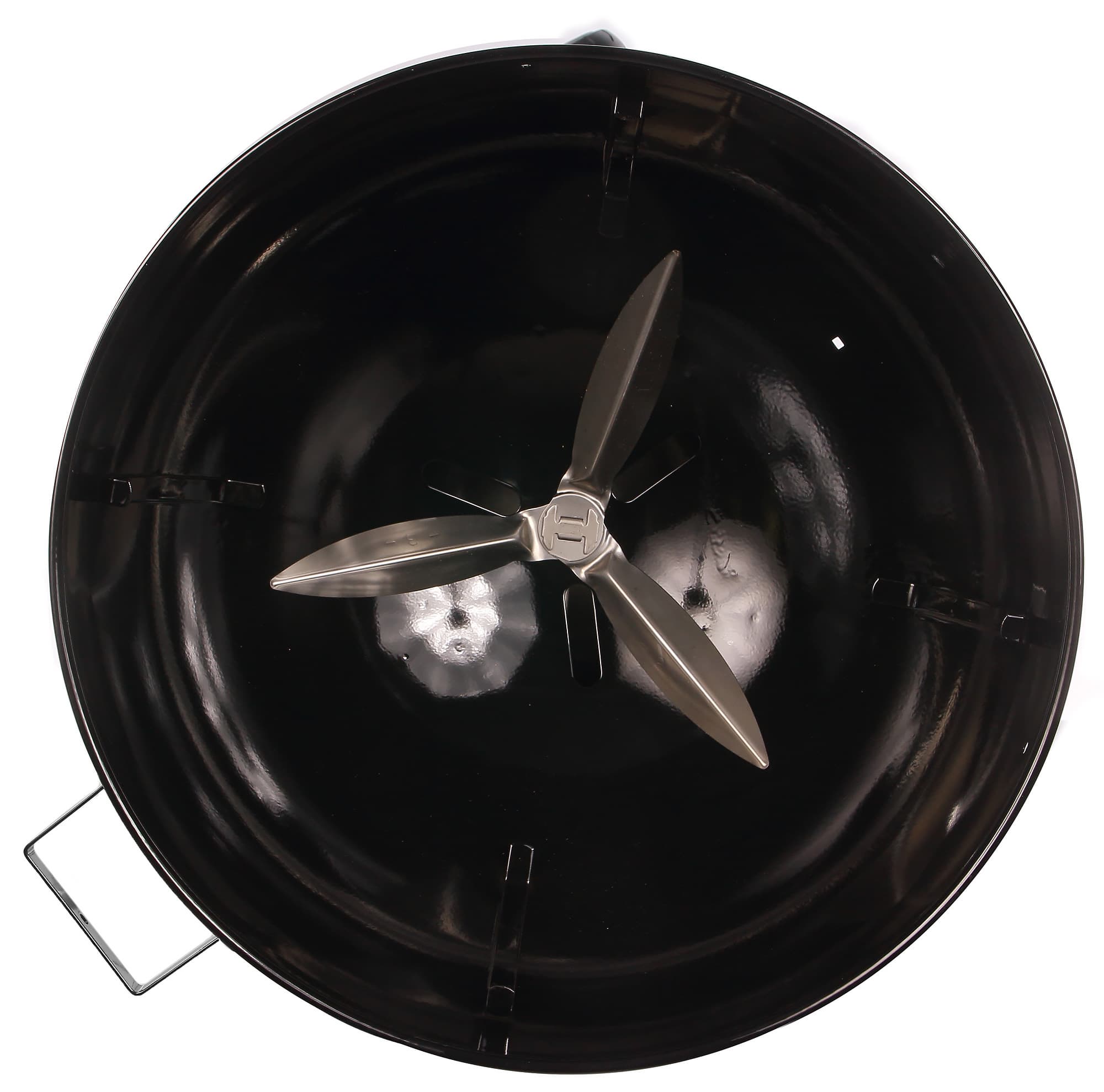 Заглянув в нижнюю полусферу гриля, видим лопасти: это их положение регулирует рычажок, который мы рассматривали выше. Они могут закрывать, открывать и приоткрывать отверстия для поддува, а также, будучи провернутыми туда-обратно, легко очищать нижнюю поверхность от золы и пепла (это и есть система очистки от пепла One-Touch, вполне удачное название).