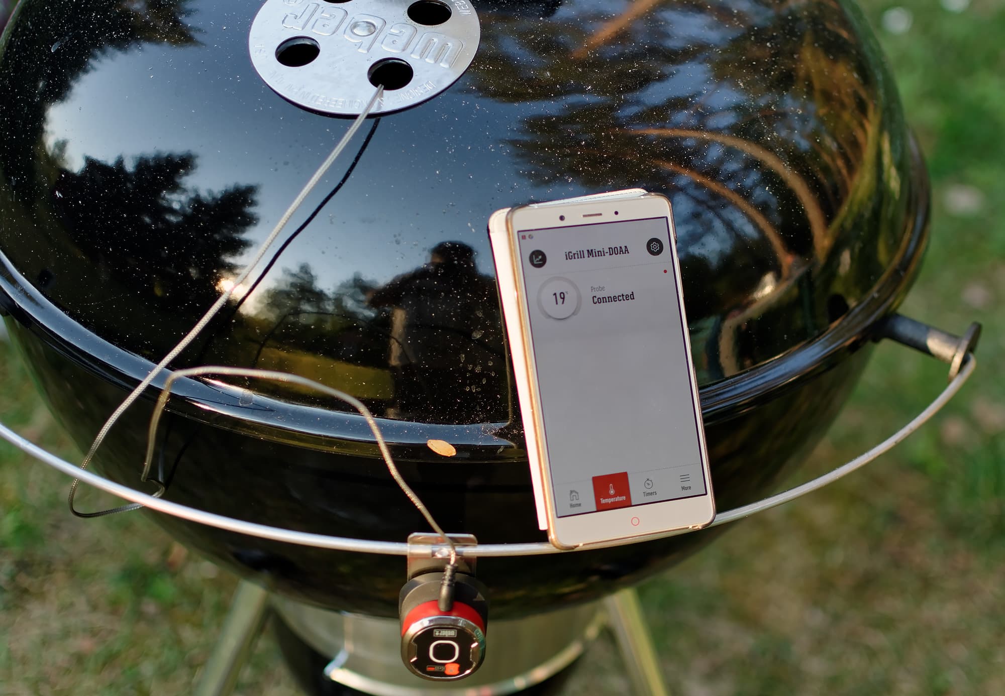 В самую нежную часть, грудку, воткнули щуп от iGrill mini, а внешнюю часть прибора закрепили снаружи на гриле.