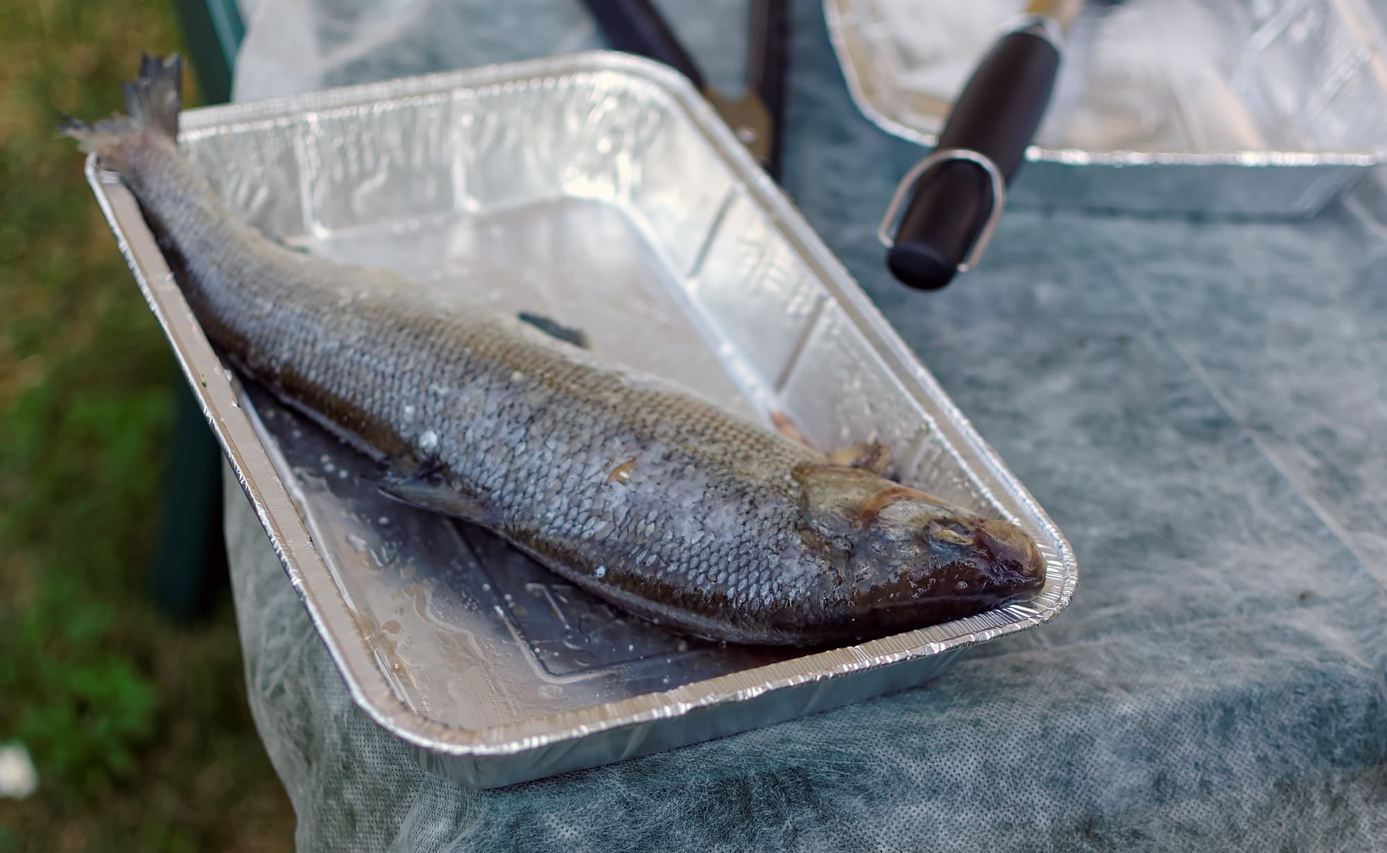 Попробовали закоптить рыбу подручными средствами. Для этого мы использовали лоток для рыбы из арсенала Weber, а также размороженного в холодильнике муксуна весом примерно 1,2 кг, натертого солью.