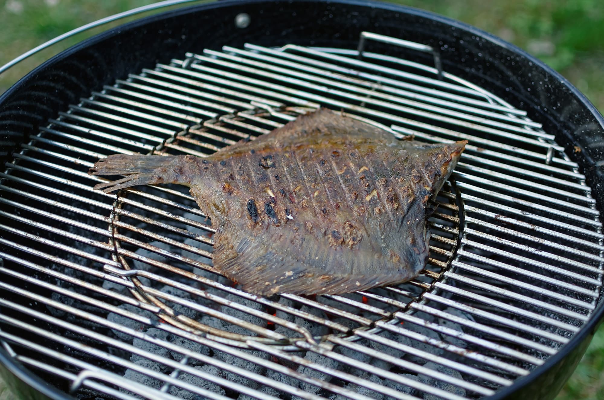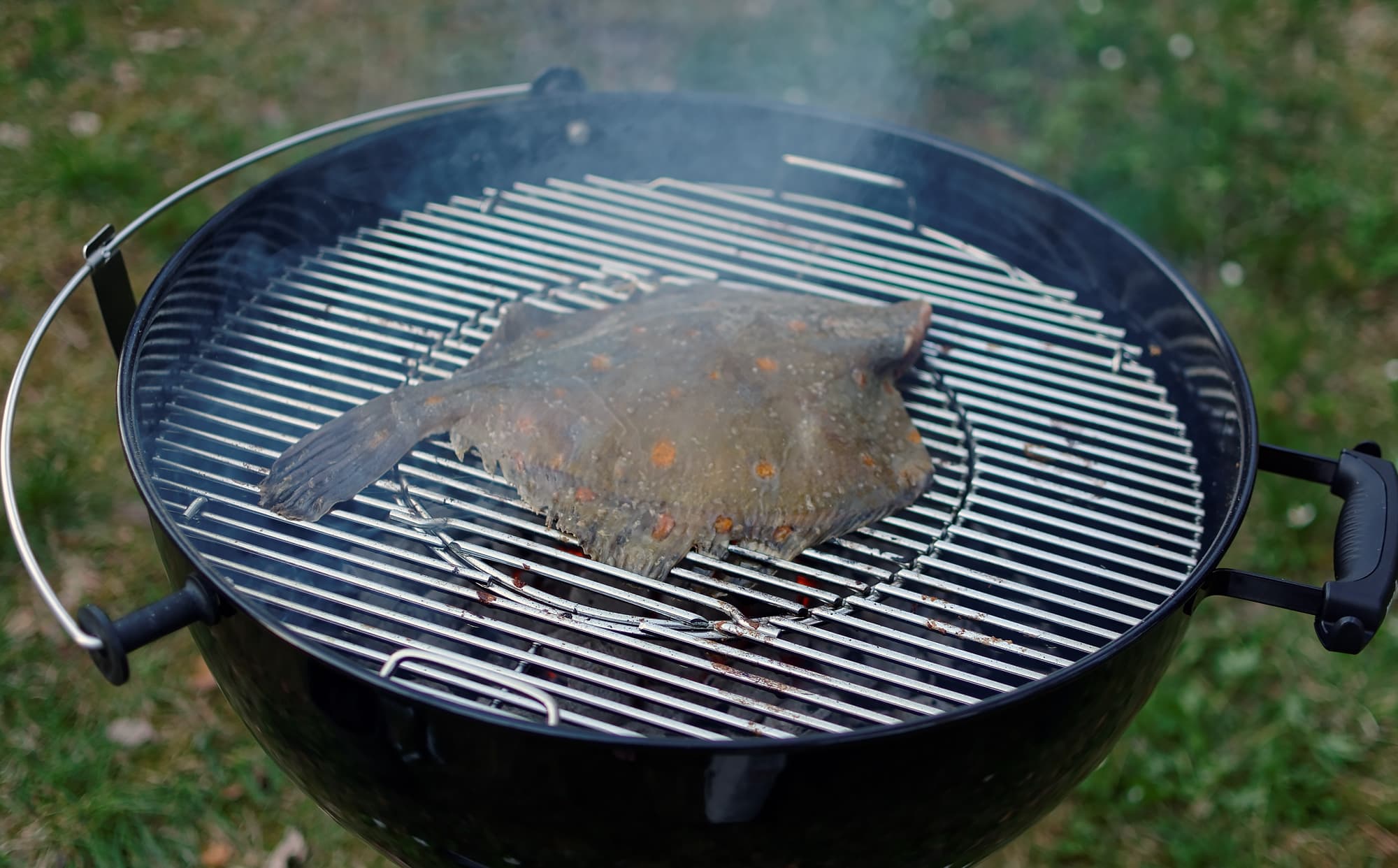 Решетку гриля как следует очистили от остатков предыдущих экспериментов, закрыли крышкой и дали нагреться. Далее прикрыли заслонку в крышке, обнаружив понижение температуры в гриле, чего, собственно, и добивались, так как рыба — штука нежная.