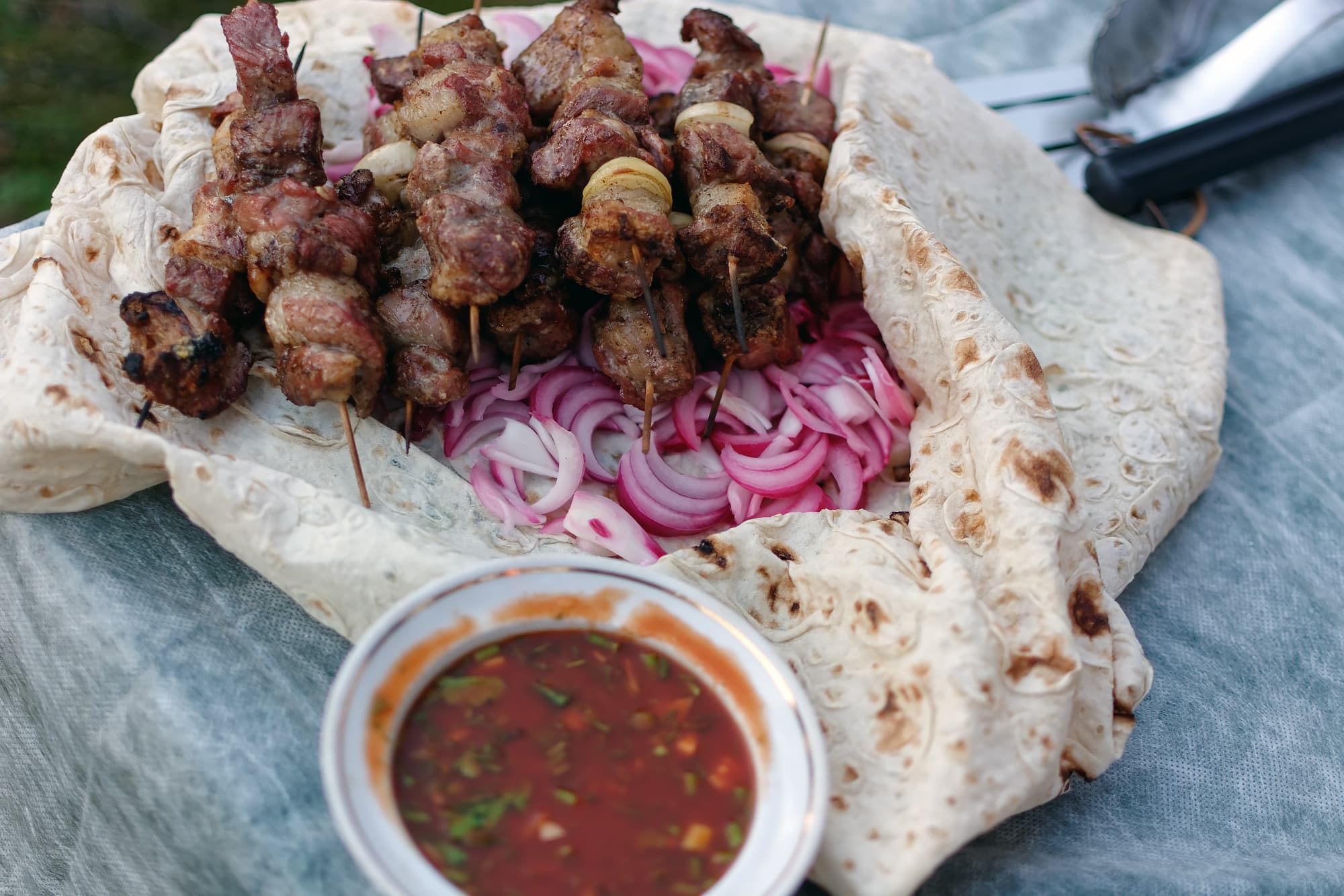 Готовность определяли по внешнему виду. К баранине подали лаваш, предварительно замаринованный крымский лук (пару луковиц нарезали перьями и побрызгали уксусом, перемешали и дали постоять с полчаса), а также соус, которые многие наверняка помнят по советскому югу: томатная паста, вода, соль, немного аджики, чеснок и горсть зелени, в нашем случае — кинзы и петрушки).