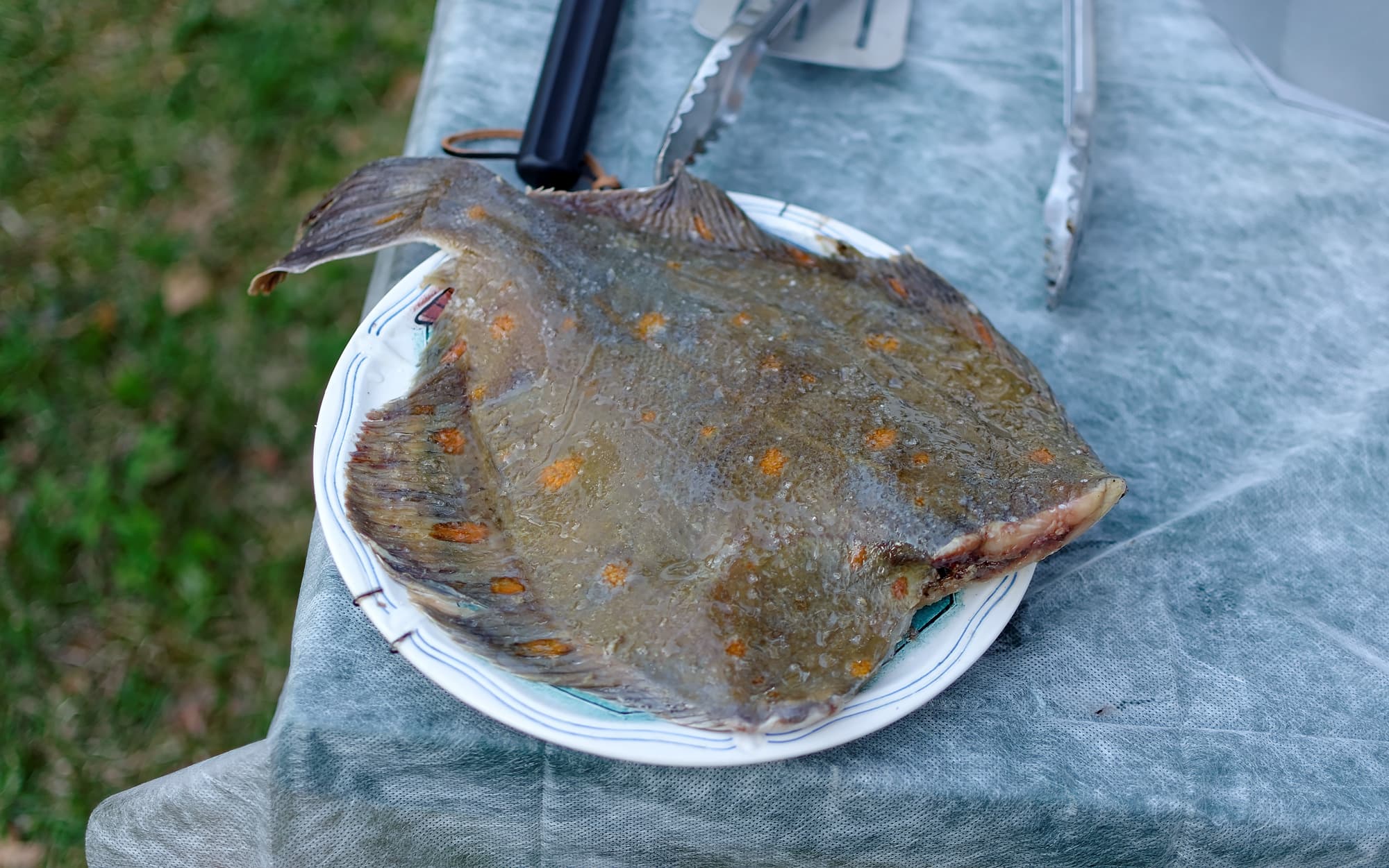 В результате получили отличную еду: хвост и плавники превратились в чипсы, которыми можно хрустеть, а сама камбала осталась внутри нежнейшей: это должно быть заметно по фото ниже, где мы немного поскребли рыбине брюшко.