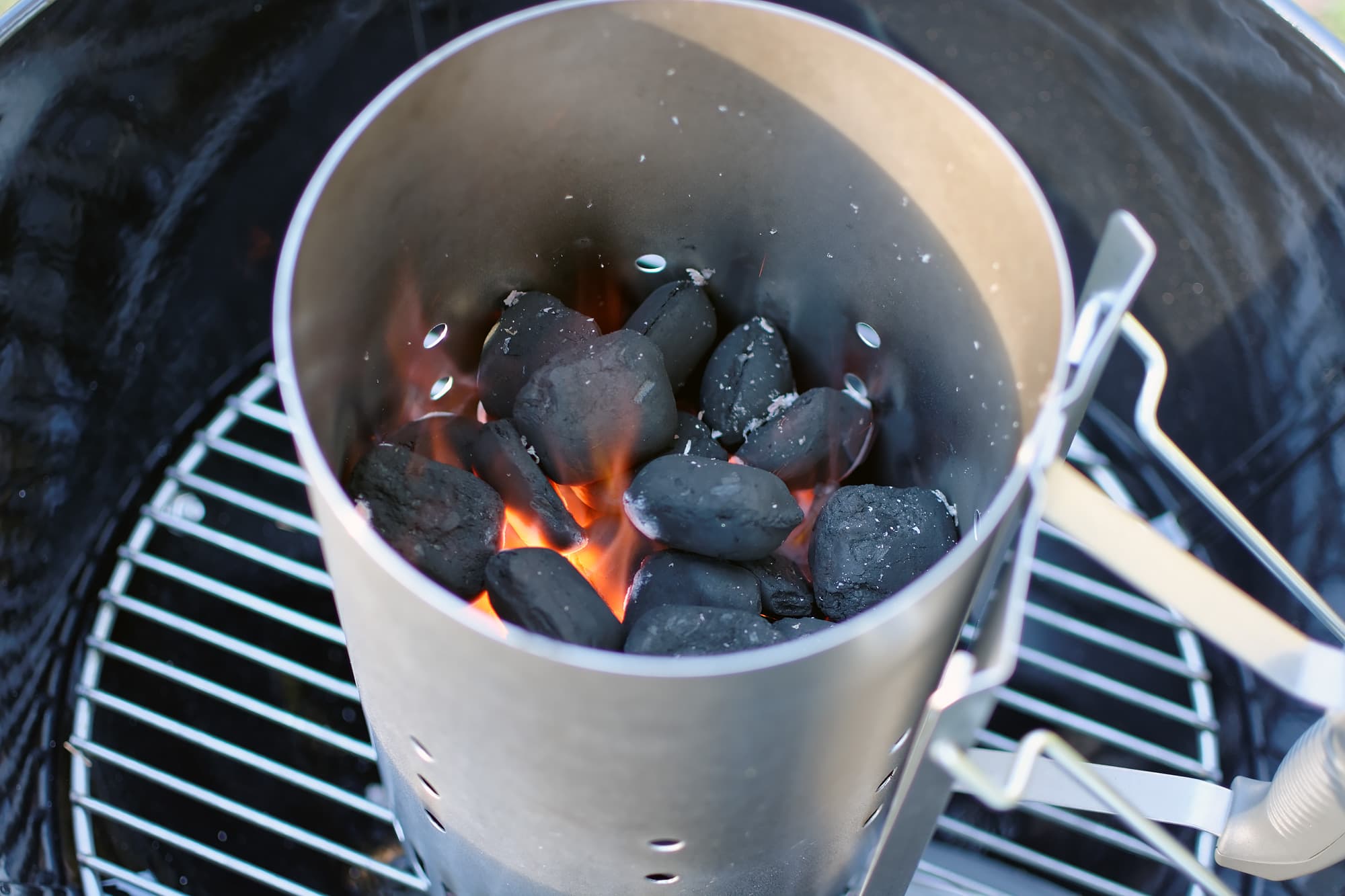На этом моменте у нас закончились брикеты Weber и мы начали экспериментировать с углем банальным, иначе называемым «с придорожной заправки». Стартер с ним справляется отлично, а вот удобство накладывания и равномерность прожарки, как выяснилось, сильно уступают фирменным брикетам.