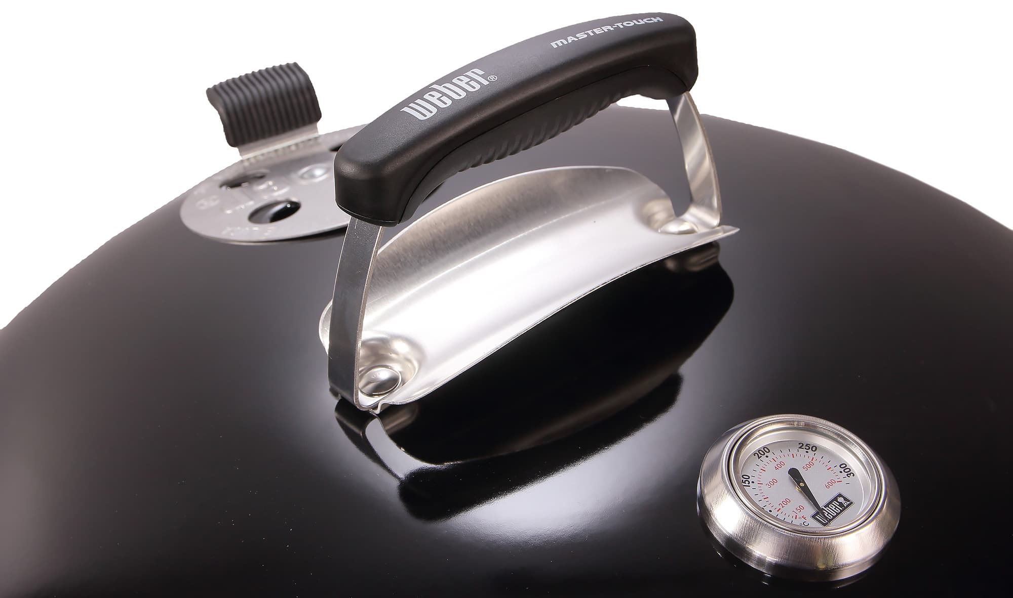 Крышка гриля оснащена удобной нескользящей и ненагревающейся ручкой, заслонка для отверстий в гриле, необходимых для регулировки тяги и, соответственно, интенсивности жара, также снабжена удобным рычажком с ребрами для предотвращения скольжения.