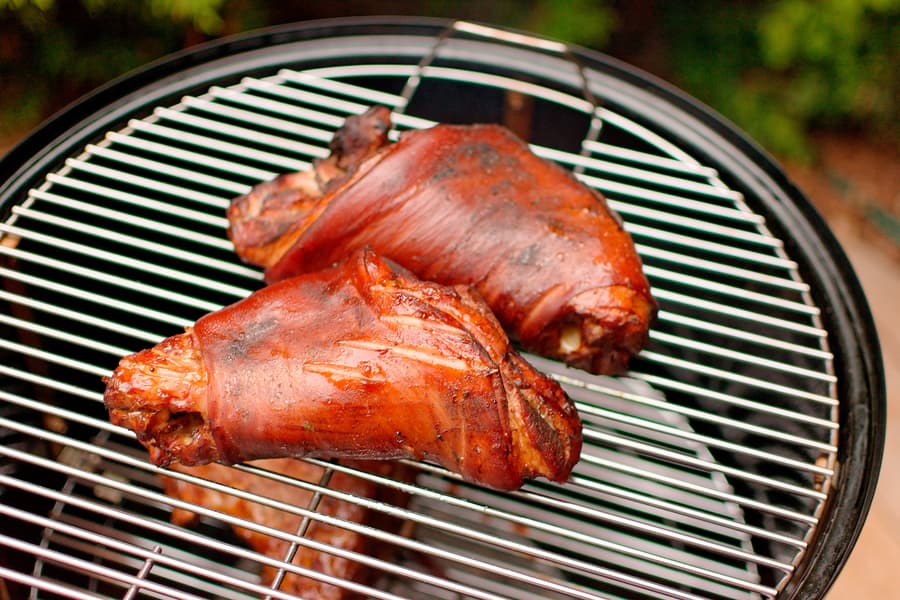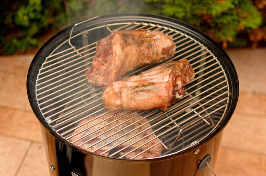 Рульки разместили на верхней решетке коптильни, в которой предварительно разожгли угольные брикеты и добавили к ним заранее замоченные дрова для копчения.