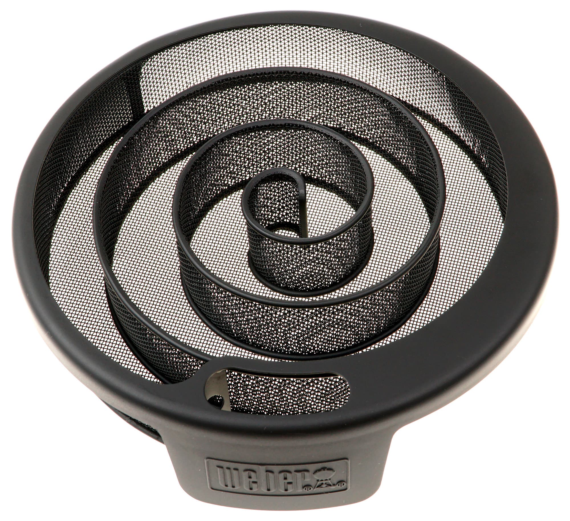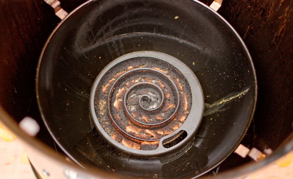Далее «правильно подожженную» спираль следует положить на дно чаши (куда при горячем копчении наливается вода), и далее как всегда: установить решетки с продуктами и закрыть коптильню крышкой. Weber обещает 10 часов медленного тления опилок, мы насчитали даже 12. Вот как выглядел полностью выгоревший дымогенератор.