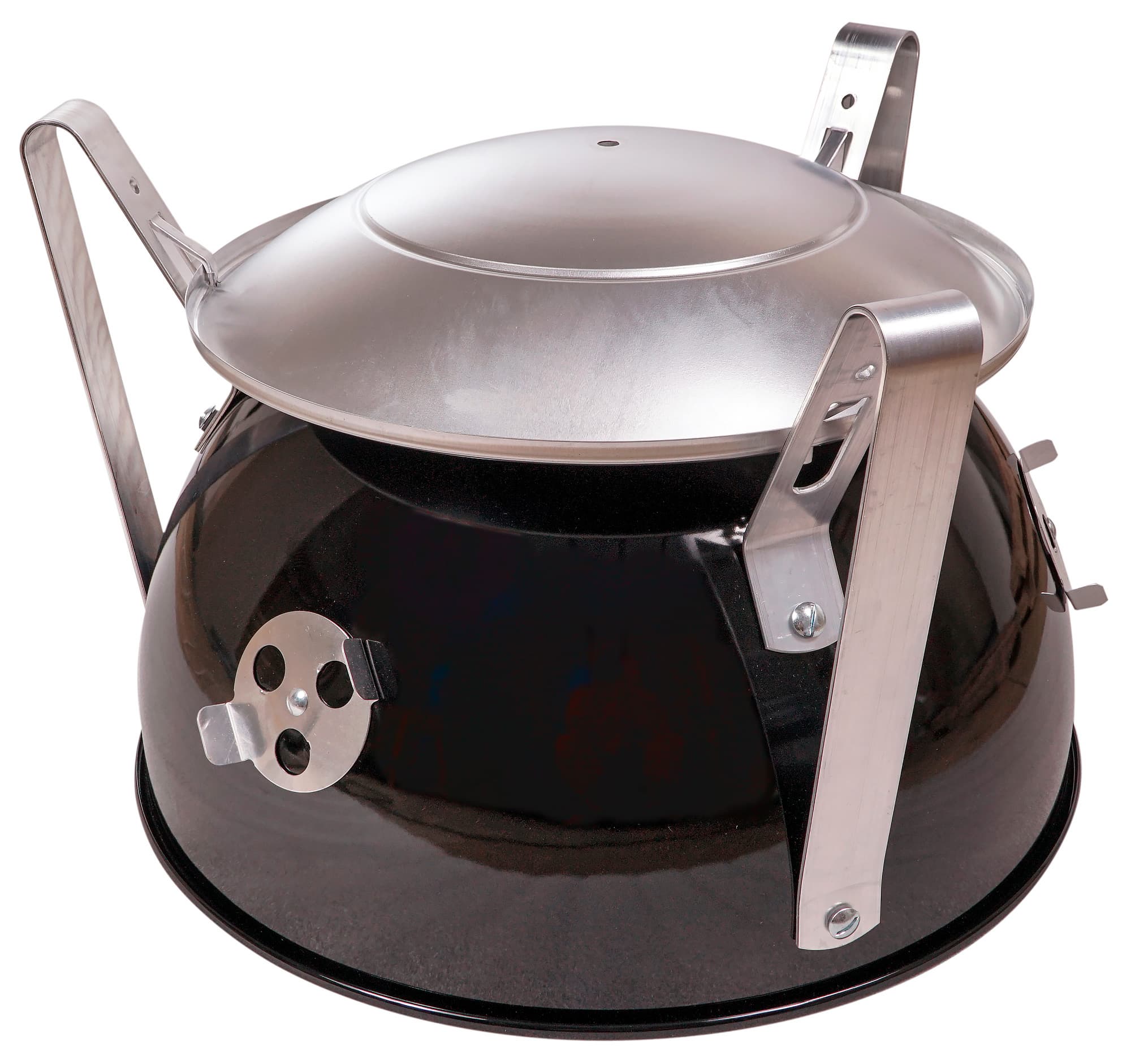 Над ними на креплениях на стенках коптильни подвешивается полукруглая чаша. В процессе копчения туда наливается вода, чтобы за счет испарения обеспечить высокую влажность и не дать температуре подняться слишком высоко.