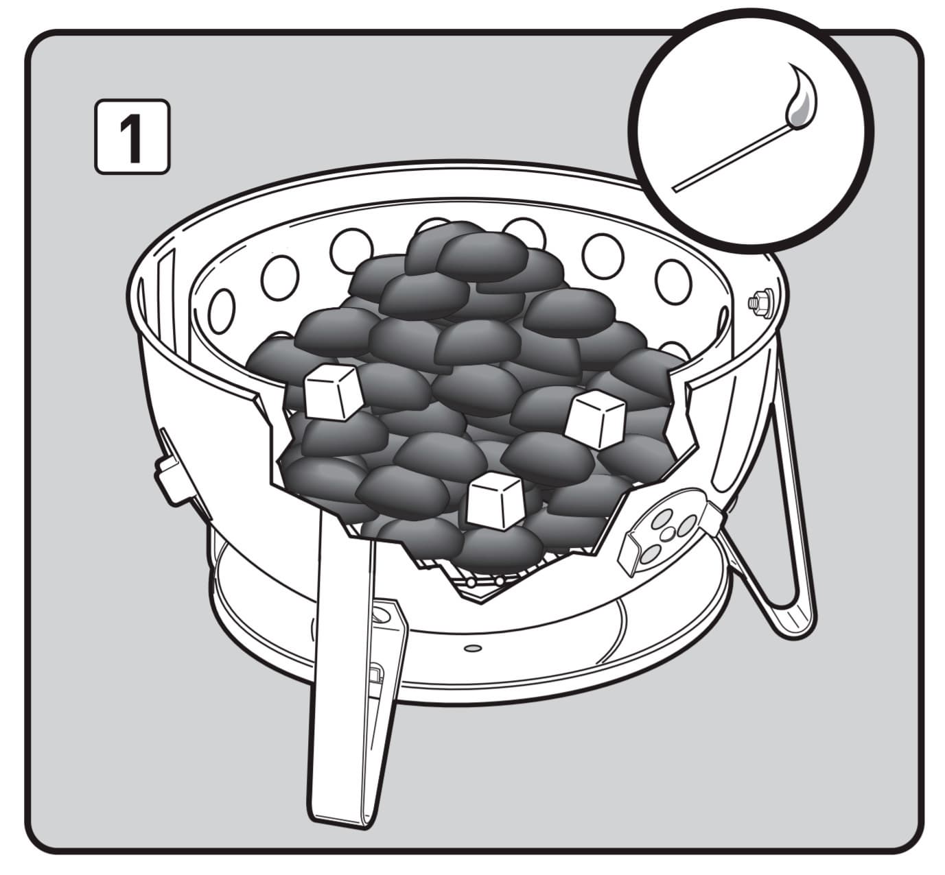 Инструкция рекомендует для начала оставить от коптильни только донную часть и разжигать уголь прямо в ней, насыпав в камеру угольных брикетов и раскидав сверху некоторое количество фирменных кубиков для розжига. Этому процессу даже посвящена специальная иллюстрация.
