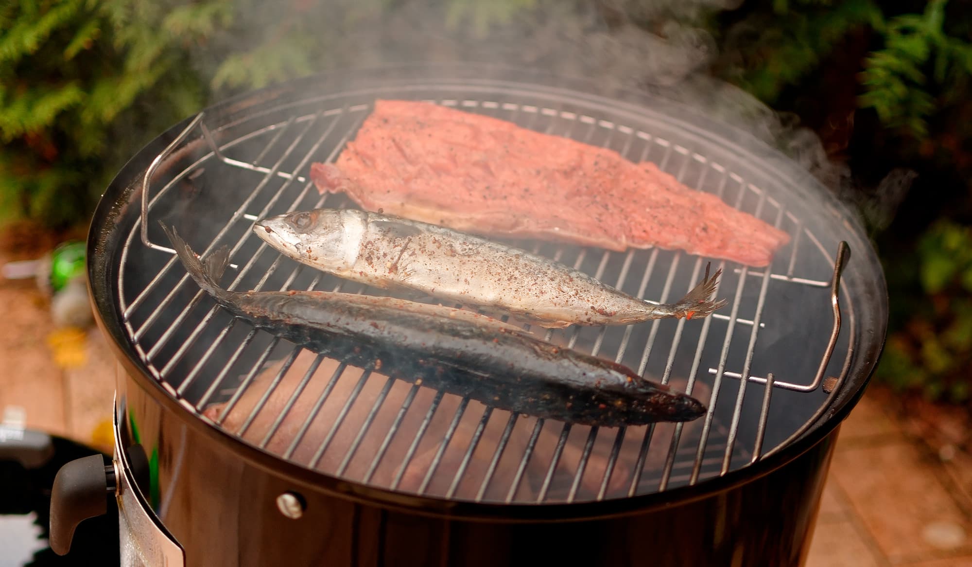 Мы экспериментировали с фирменными веберовскими «чурочками» — как мочеными, так и сухими, с фирменной и нефирменной щепой, уложенной в smoking box (опять-таки: моченой или сухой), и пришли к выводу, что с точки зрения средств получения дыма коптильня практически всеядна. Главное, чтобы вы сами понимали, чего хотите добиться, например, замачиванием.