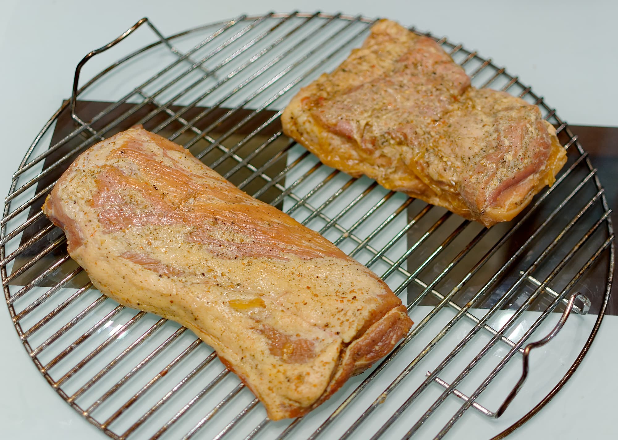 Один из кусков приготовили в су-виде на 70 °C, второй положили на решетку коптильни сырым, немного обсушив от рассола и стряхнув лишние специи.