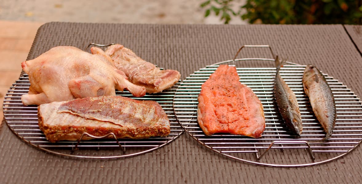 Продукты использовались не слишком дорогие и без труда доступные в любом городе, где есть рынок. В качестве эксперимента мы закоптили горячим способом свиные рульки и бараний окорок, получив прекрасные блюда для ужина. Эксперимент нам понравился, и мы продолжили тесты, закоптив два вида рыбы (горбушу и скумбрию) холодным и горячим способом, а также целых четыре вида свиной грудинки: сырокопченую и варено-копченую — опять же холодным и горячим дымом.