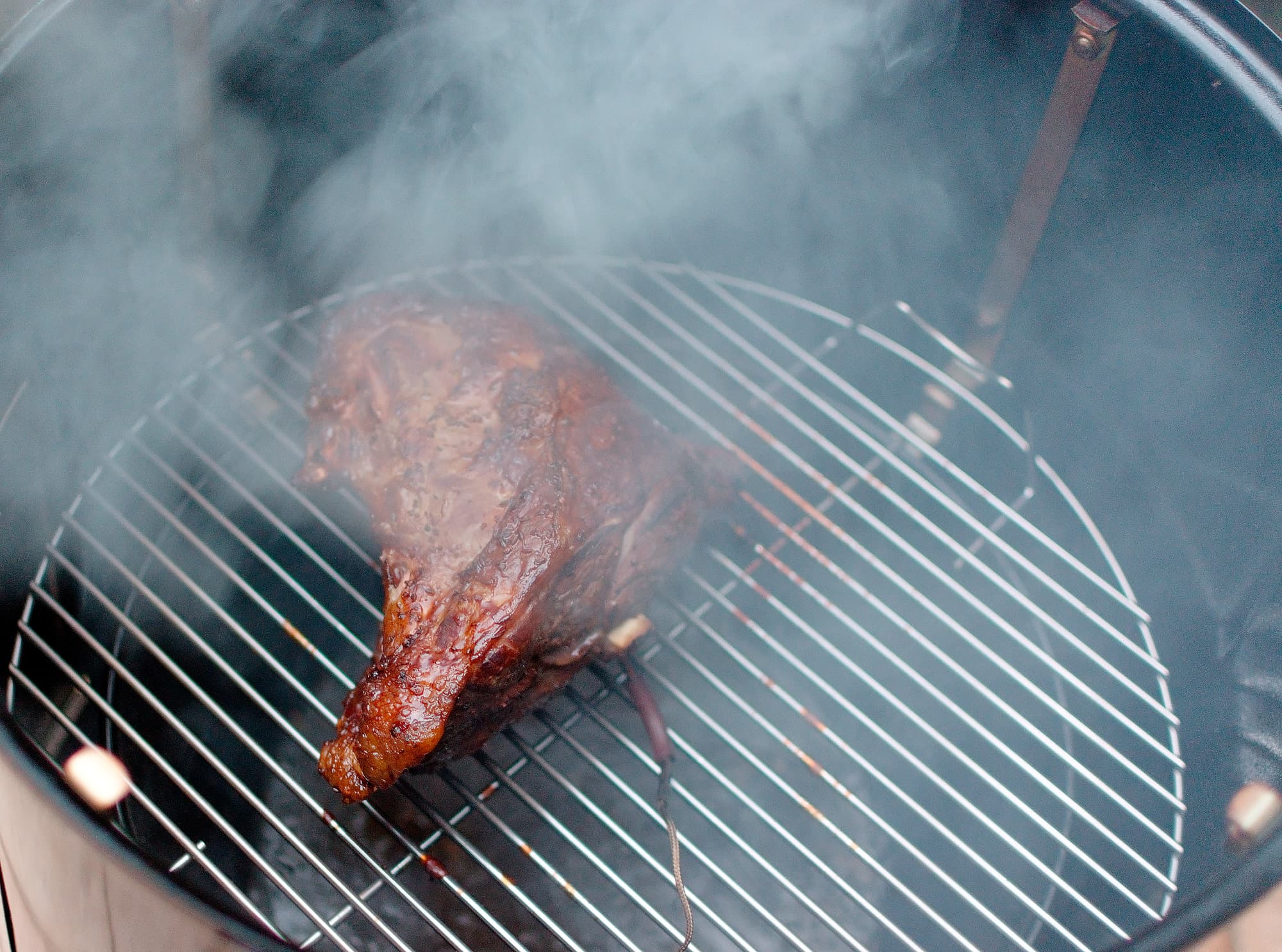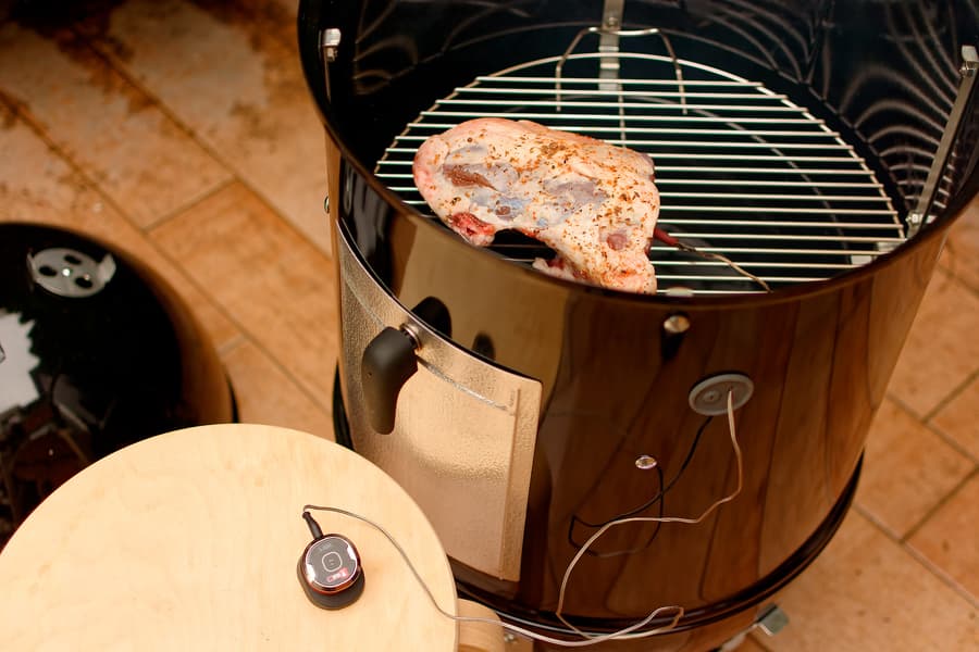 IGrill настроили с телефона на среднюю прожарку бараньего окорока и дождались, пока дым пропитает мясо, а угли нагреют его до 65 градусов.