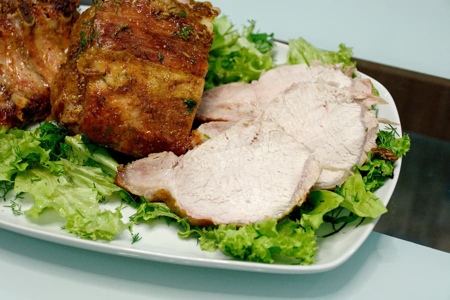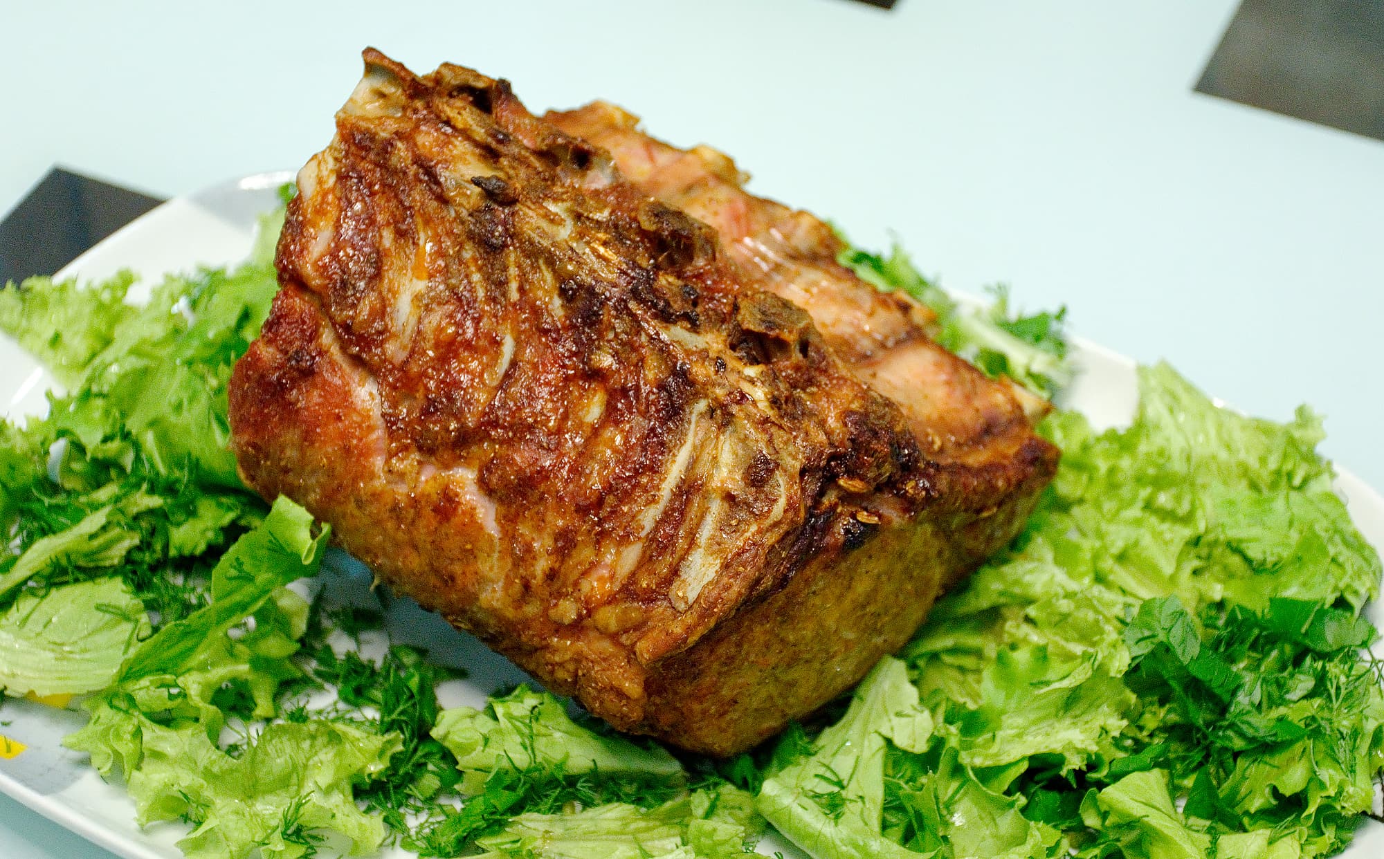 Начали мы с простого, незамысловатого и всем понятного мяса: свиной корейки. Кусок наш весил примерно 2 килограмма. Он был посолен, посыпан хмели-сунели и семенами фенхеля и оставлен в холодильнике на сутки.