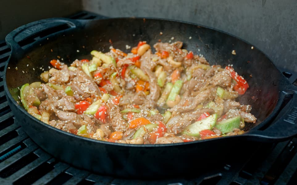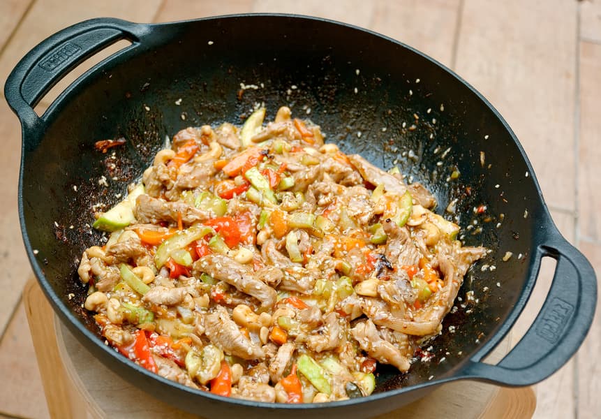 Потом мясо, затем содержимое блюдца с чесноком-имбирем, затем кабачок и кешью.