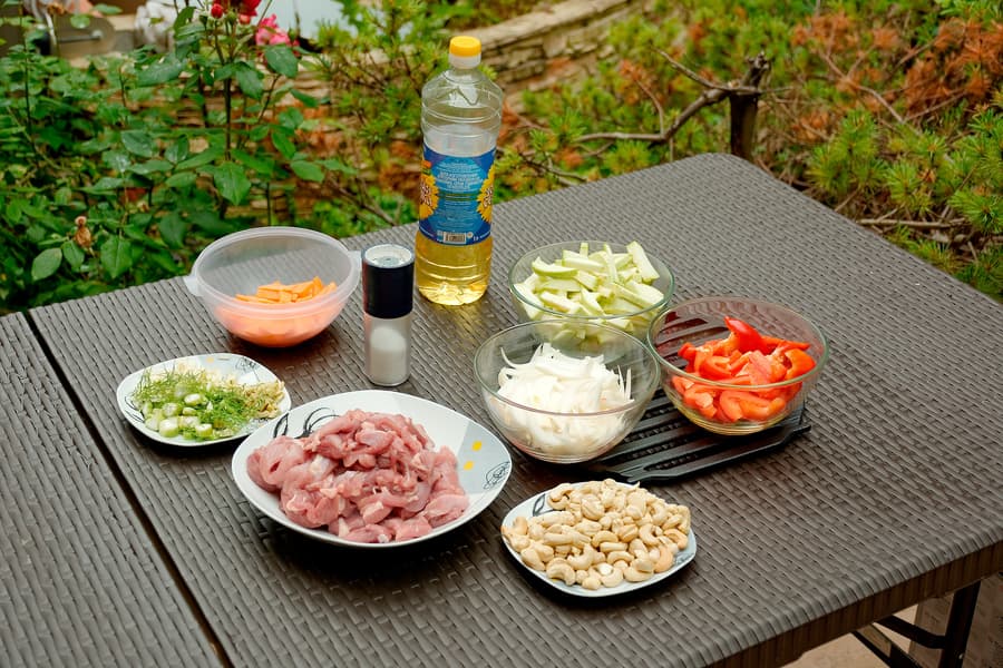 На случай, если гриль нагреется очень быстро (спойлер: так оно и вышло), заранее нарезали примерно килограмм филе бедра индейки, луковицу, болгарский перец, молодую морковку, небольшой кабачок. Нарубили 3 зубчика чеснока, зелень фенхеля и кусок имбиря размером с фалангу большого пальца взрослого человека. Также нам понадобится соль, масло, ложка меда, около 200 граммов кешью, горсть кунжута и пара ложек крахмала (картофельного или кукурузного — какой есть).