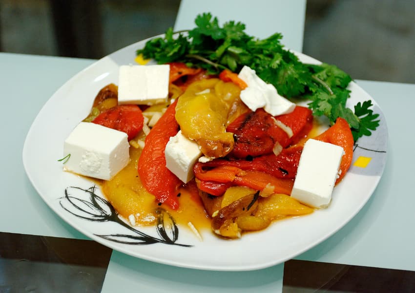 Мякоть нарвали полосками, добавили щепотку соли, пару зубчиков нарезанного чеснока и крупные куски феты. Готово!