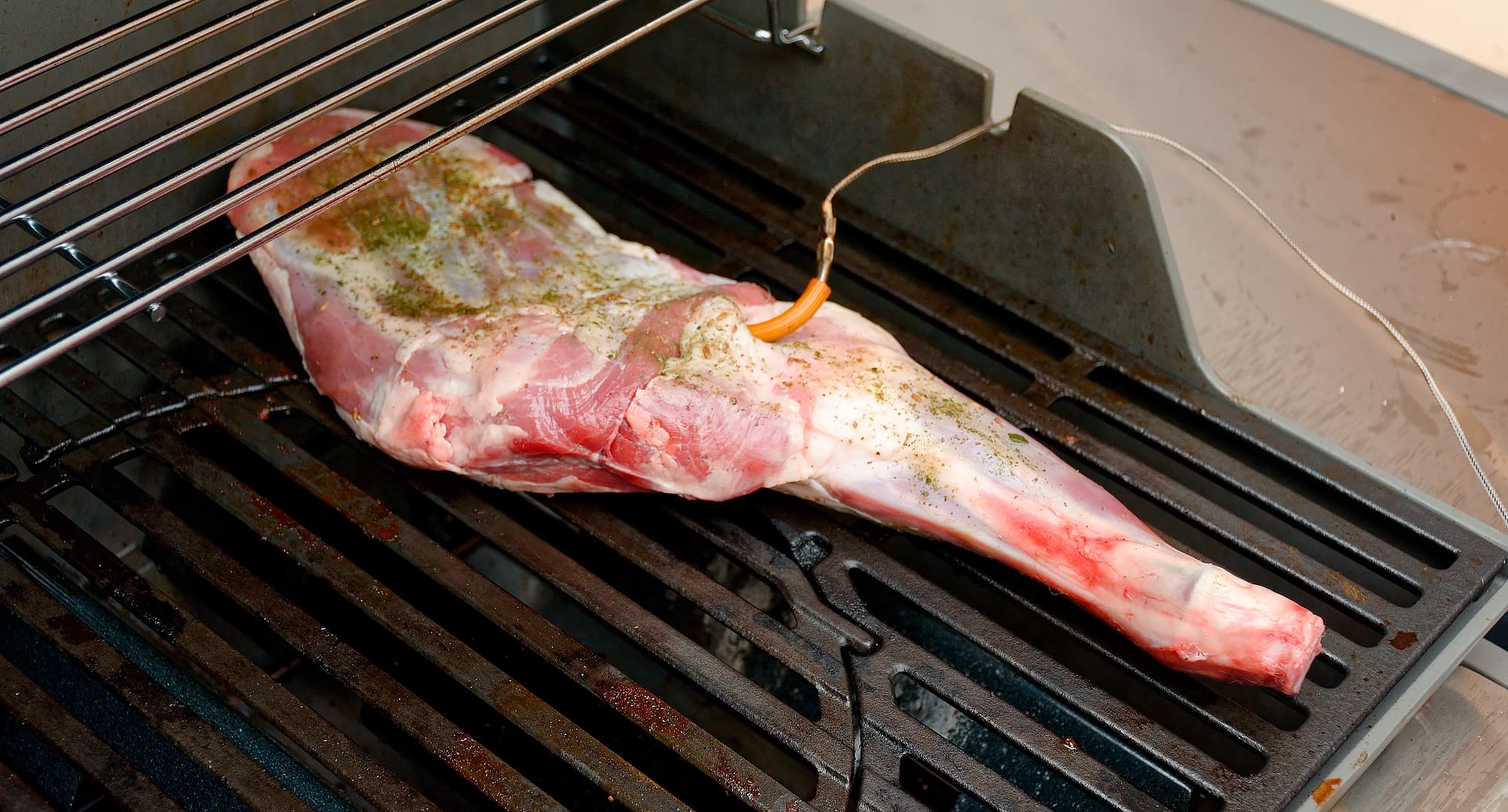 Ящик прилаживали к грилю так и сяк, и наконец нашли позу, в которой он отлично вмещается под решеткой. Зажгли левую и среднюю горелку, а справа разместили небольшую переднюю ножку барашка весом примерно 1,8 кг. Для общих сведений: на решетку гриля можно поместить три таких ножки. В мясо воткнули щуп iGrill и поставили на среднюю прожарку.