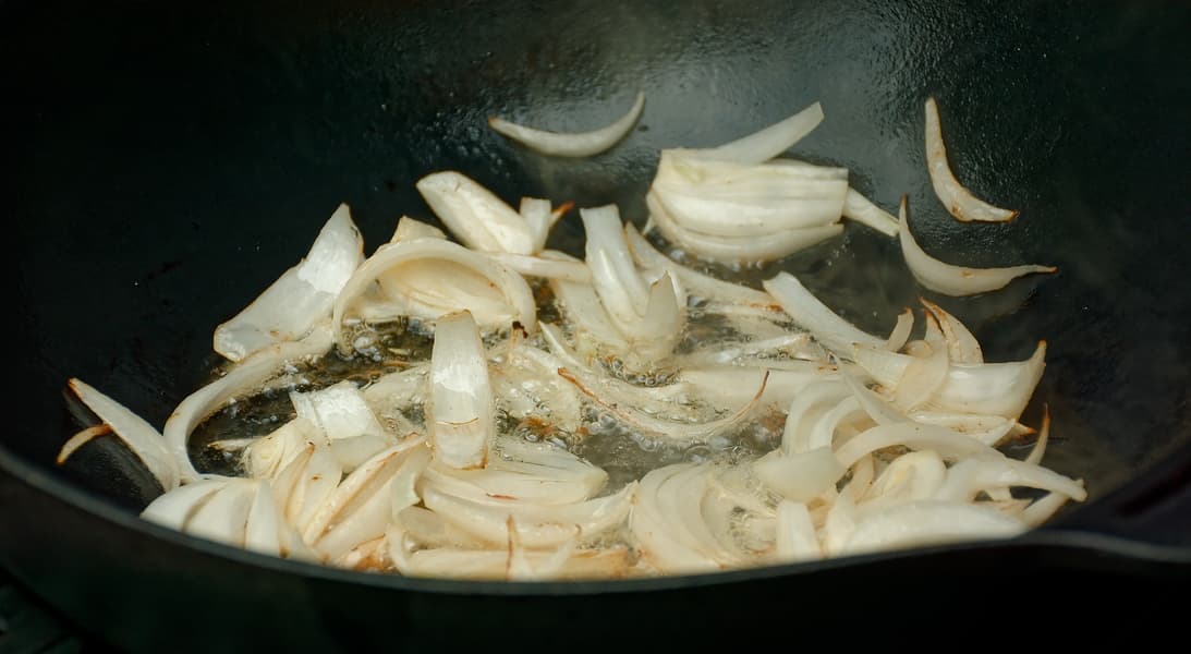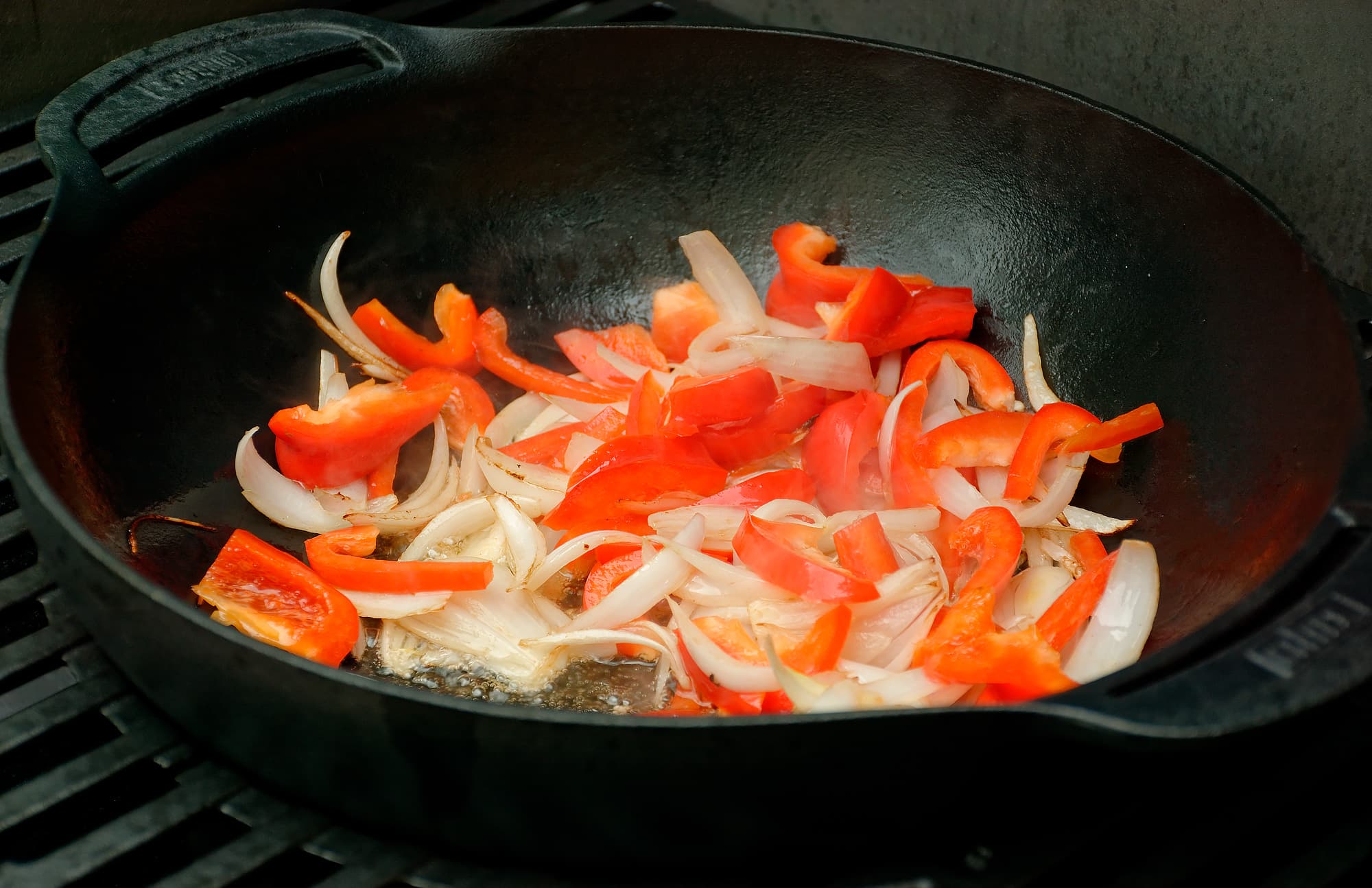 Процесс оказался крайне приятным. Налили масла на дно разогретого вока, когда оно раскалилось, бросили луковицу. Помешивали мы в процессе приготовления с помощью длинной фирменной лопатки от Weber, снимали вок их же перчатками. Лопатку можно взять и деревянную (лишь бы была длинная), а вот перчатки — это реально удобно.