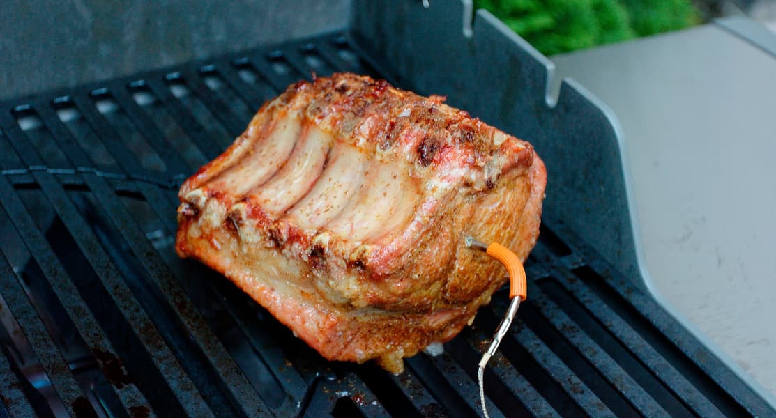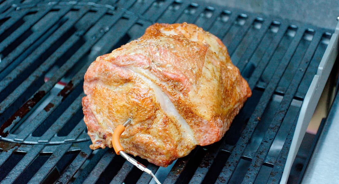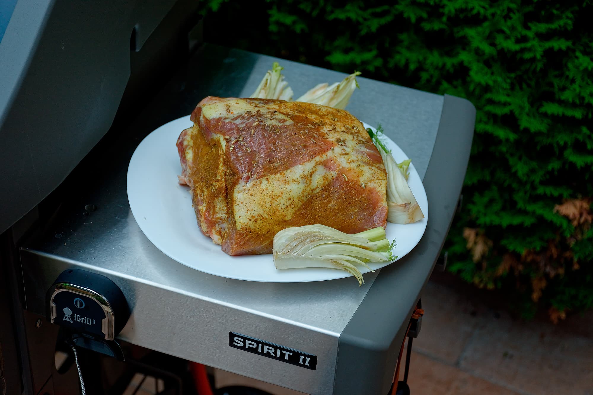 Затем мы обтерли кусок от влаги бумажной салфеткой и положили на правую часть гриля, разогретого до температуры в 200 градусов под крышкой. Под свининой газ не включали, то есть она запекалась, как в духовке, в горячем воздухе, нагреваемом средней и левой горелками. Внутрь корейки воткнули щуп электронного термометра, а на смартфоне выбрали подходящий отруб для свинины. Затем закрыли крышку.