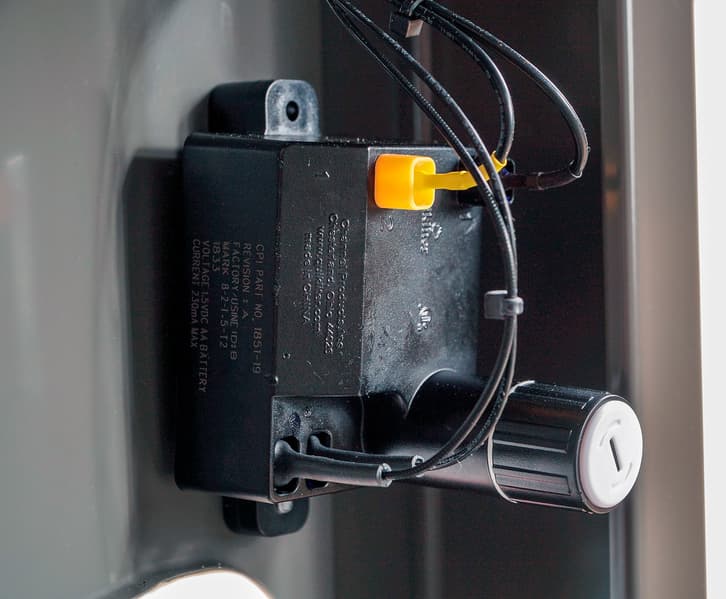 Батарейка вставляется в специальный отсек, расположенный довольно далеко от кнопки электроподжига. В чем здесь состоит смысл, мы так и не поняли: у Weber Q 2200 она вставлялась прямо в кнопку, и за счет этого проводов было сильно меньше.