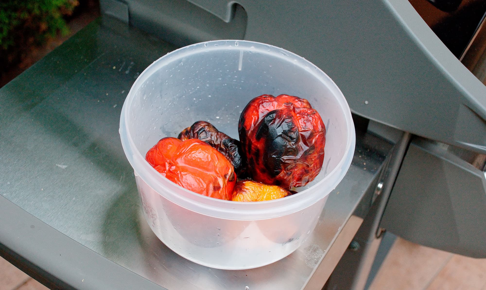 Испеченные перцы сложили в пластиковый контейнер и на несколько минут закрыли крышкой. После этой процедуры перцы «запотели» и с них легко отошла шкурка. Мы удалили шкурку, хвостики и семечки над емкостью для салата, чтобы не пролить скопившийся внутри перцев сок.