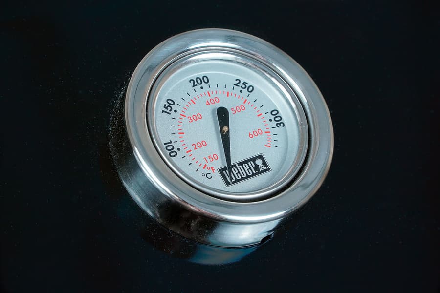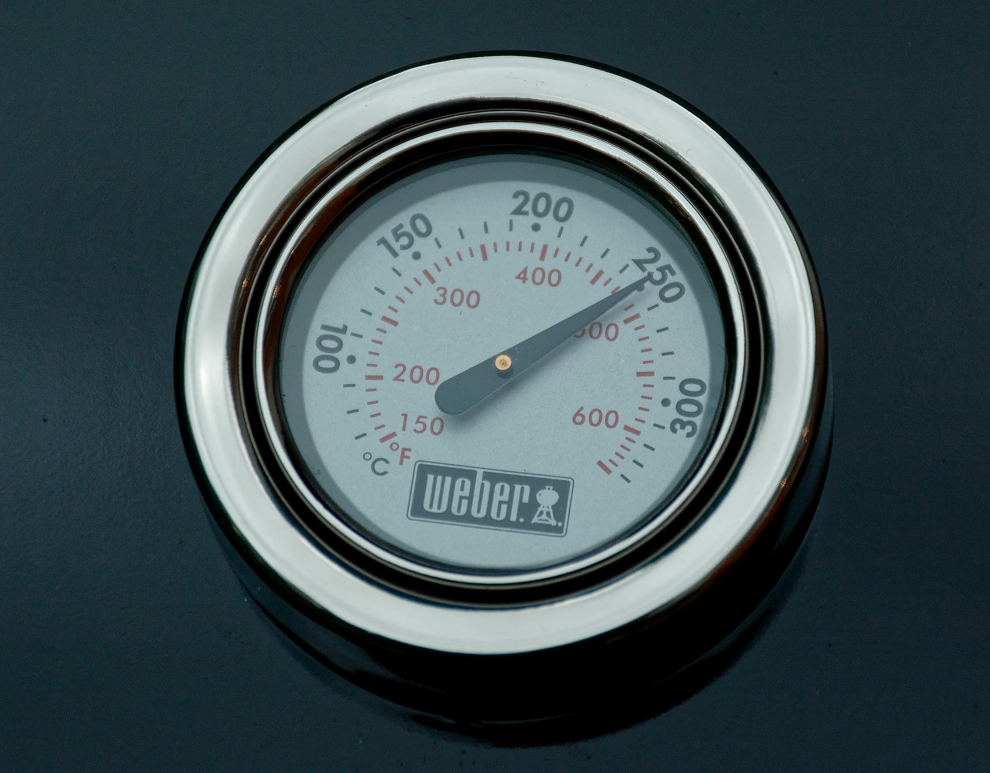 По центру крышки гриля расположен аналоговый термометр со шкалами в градусах Цельсия и Фаренгейта.