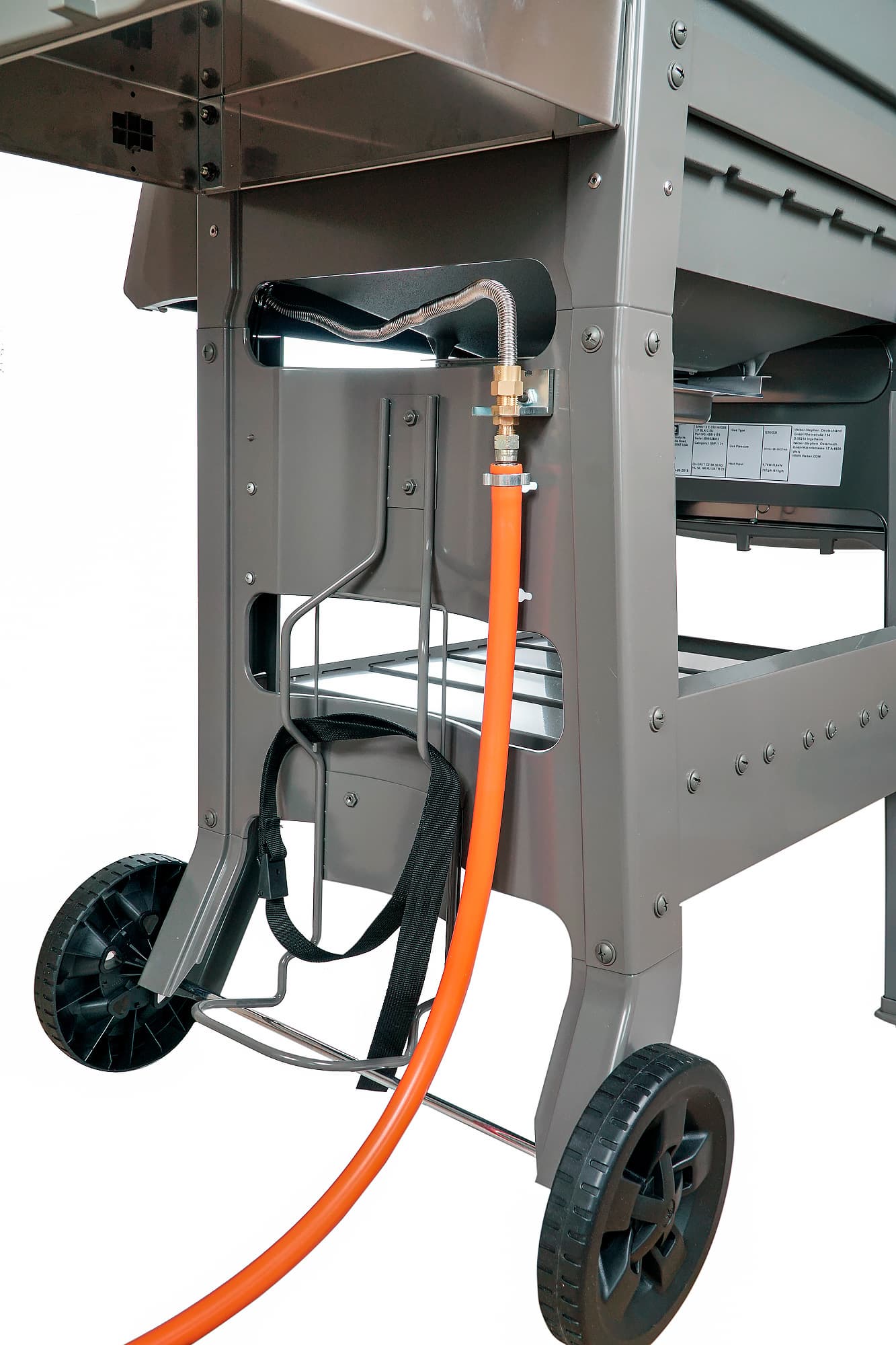 На правой стороне гриля расположено крепление для газового баллона. Баллон устанавливается на специальную подставку и притягивается к корпусу гриля тканевым ремешком. Максимальная высота баллона — 465 мм, максимальный диаметр — 318 мм.