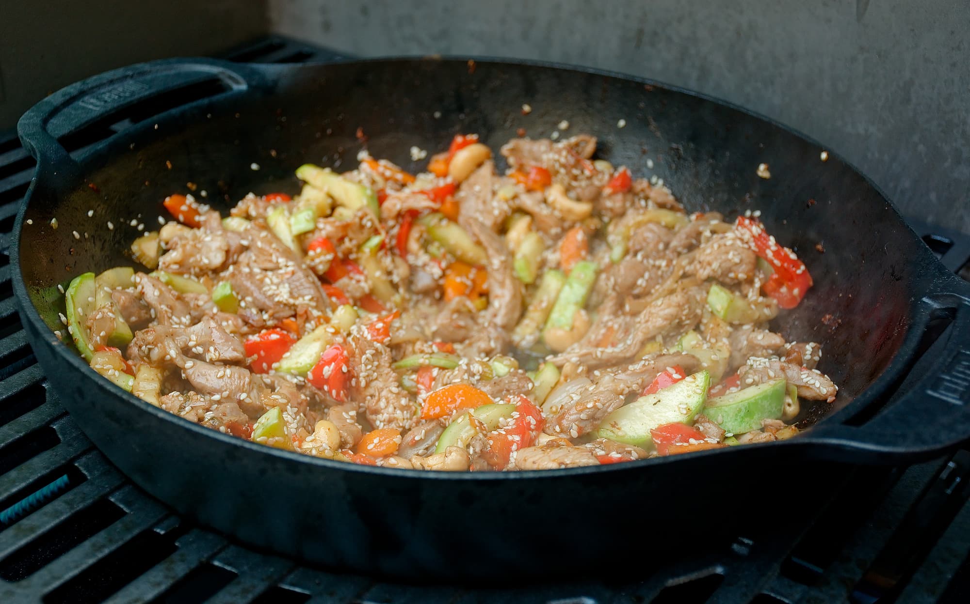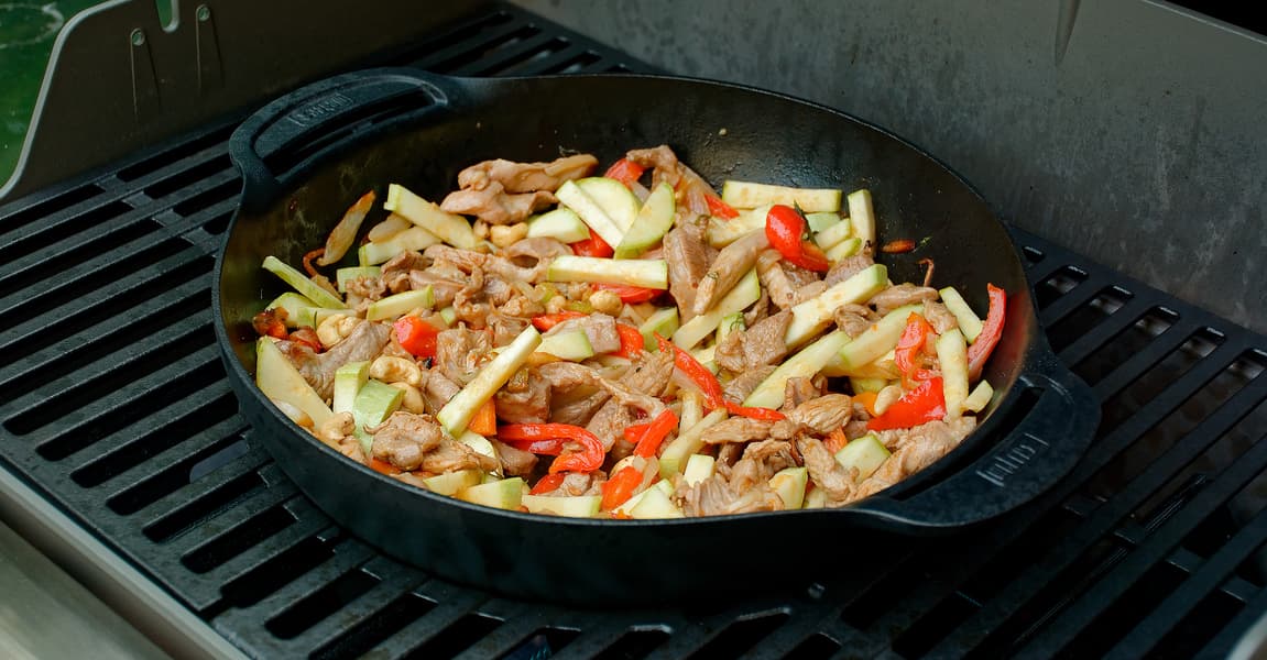 Для следующего теста мы задействовали вок. Центральную часть решетки сняли и поставили греться гриль с чугунным воком внутри.