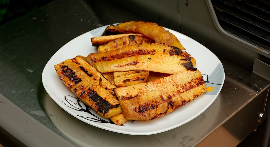 Стейков было четыре, но на решетке можно было бы при желании разместить и десяток. Поэтому решили сразу заняться гарниром: поджарить на гриле ананасы, нарезанные дольками и посыпанные солью, мускатным орехом и острым красным перцем.