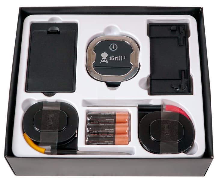 Более подробно работу с термометрами iGrill mini и iGrill 2 мы описывали в отдельной статье, поэтому сейчас будем кратки: iGrill 3 по функциональности практически идентичен iGrill 2 (про который мы уже писали), с той только разницей, что iGrill 2 представляет собой полностью самостоятельный, отдельный прибор, конструктивно выполненный в одном корпусе, а iGrill 3 предназначен для интеграции в столики газовых грилей серий Spirit II и Genesis II и конструктивно выполнен в виде основного блока и блока с батарейками, которые соединяются между собой проводом. iGrill 2/3 поддерживают одновременное подключение до четырех термощупов, в комплекте поставки идут два.