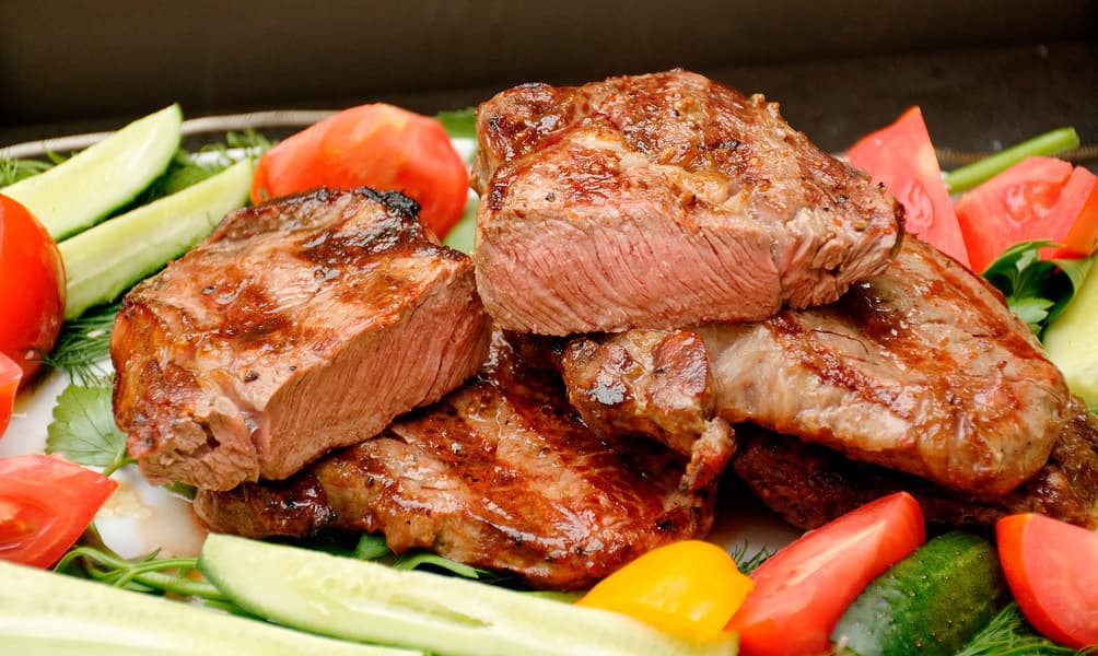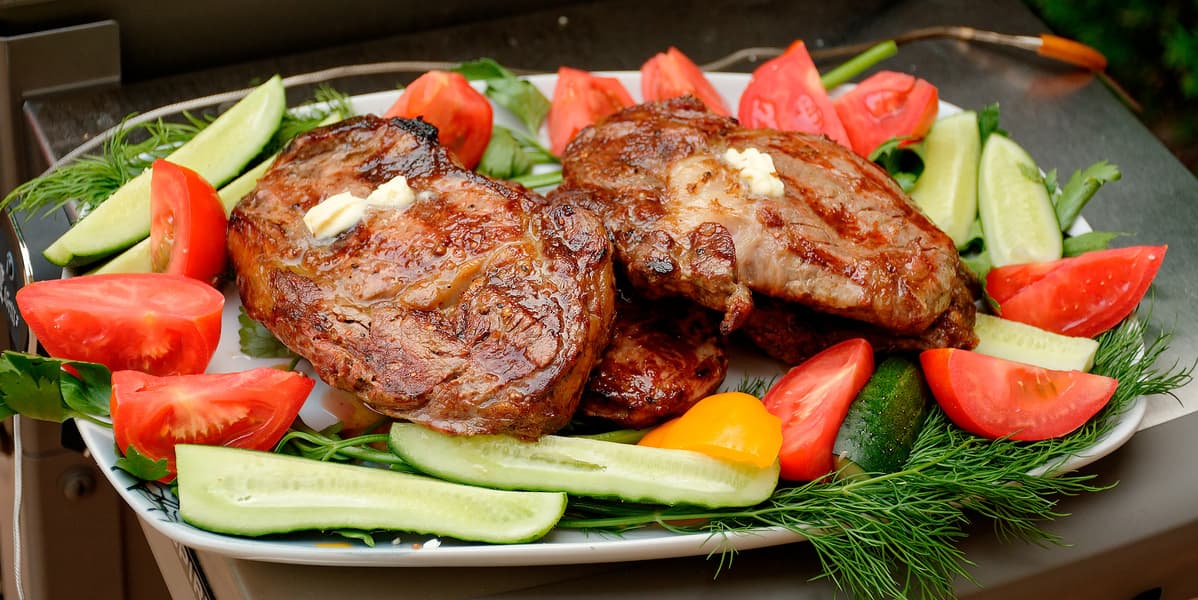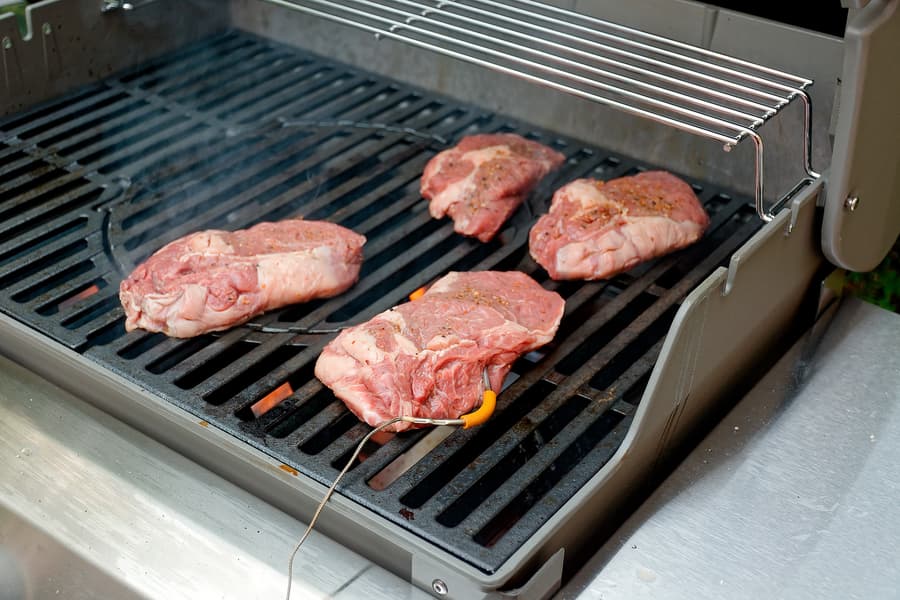 Стейки посолили, поперчили и смазали маслом. Мясо положили на решетку гриля, разогретого до 280 градусов. В один из кусков воткнули термометр с целью контроля степени прожарки.