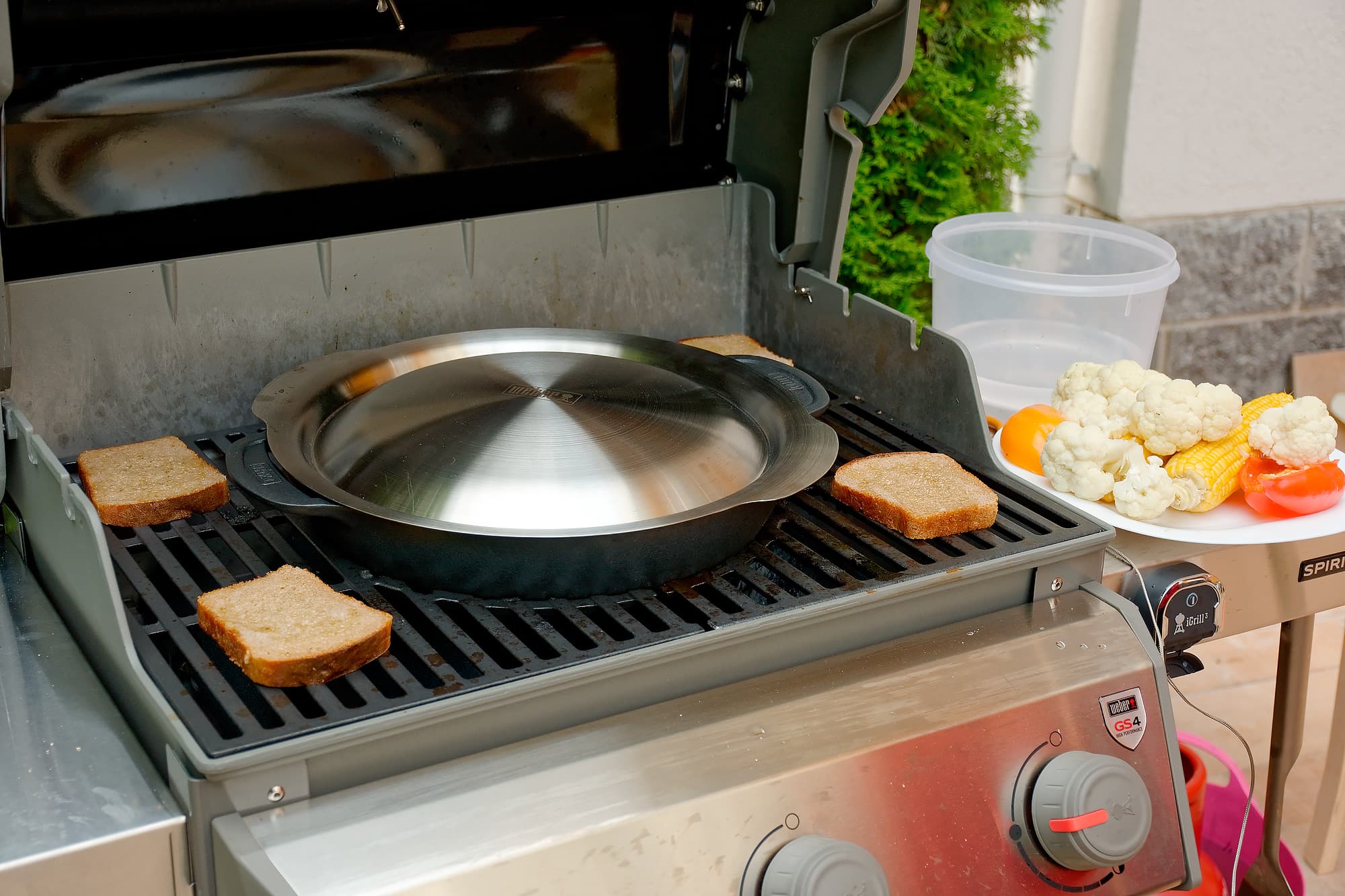Единственное, чего мы делать не стали — это заполнять поверхность гриля «под завязку»: надеемся, что наши читатели и сами догадаются, что приготовить на такой огромной жарочной площади продукты на большую компанию друзей или семью из четырех поколений удастся без труда.