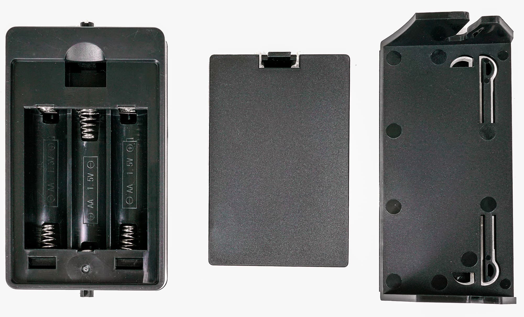 Заглушка снимается, основной блок прибора «вщелкивается» в освободившееся гнездо, блок с тремя батарейками АА вешается на специальное крепление на правой задней «ноге» и соединяется проводом с основным блоком.