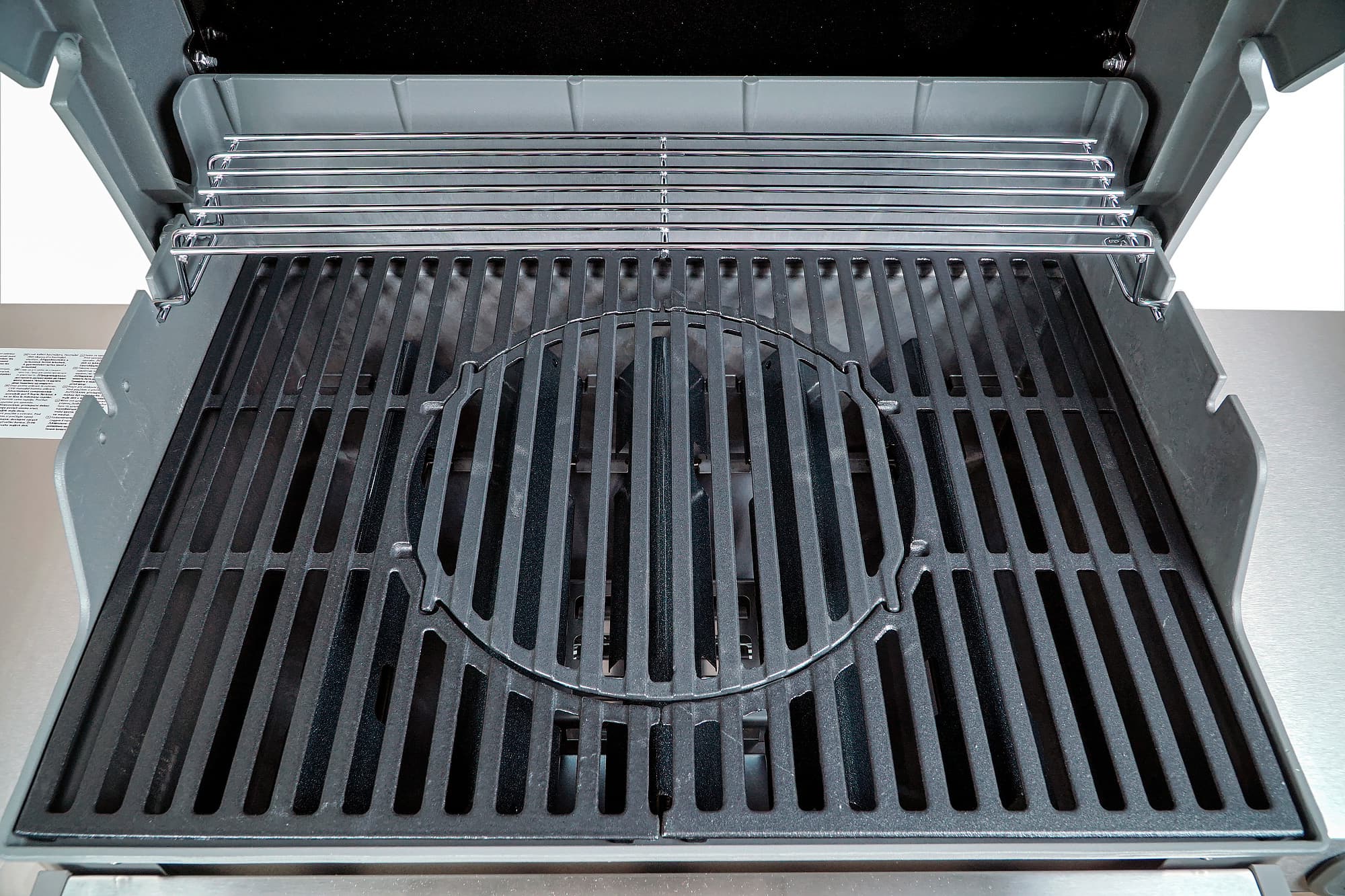 Три конфорки позволяют одним движением руки регулировать зоны прямого и непрямого жара, то есть использовать гриль еще и как огромную духовку. Приятно и наличие большого количества удобных аксессуаров, а особенно — съемной решетки, которая дает возможность не только жарить мясо, но и готовить в воке, печь, тушить, делать плов и даже готовить на пару́. С помощью столиков и внутренней решетки рабочее место получается комфортным для повара.