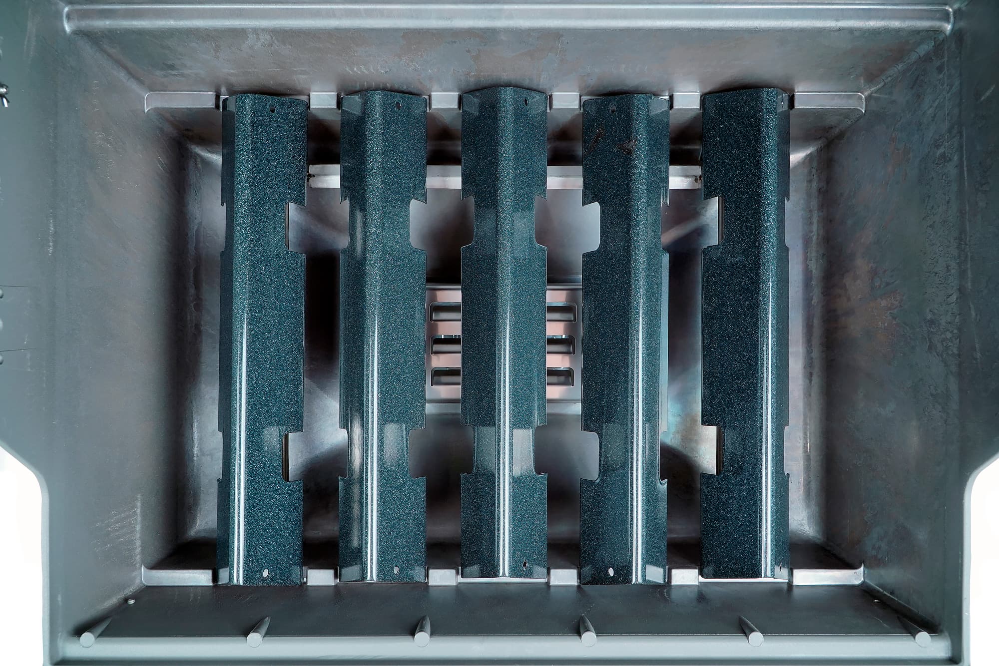 Под решеткой расположены 5 элементов, которые Weber называет Flavorizer Bars — «ароматические пластины». Они сделаны из эмалированной стали и расположены над горелками (три) и между ними (две). Попадая на эти пластины, мясные соки и жир испаряются, создавая «тот самый аромат барбекю».