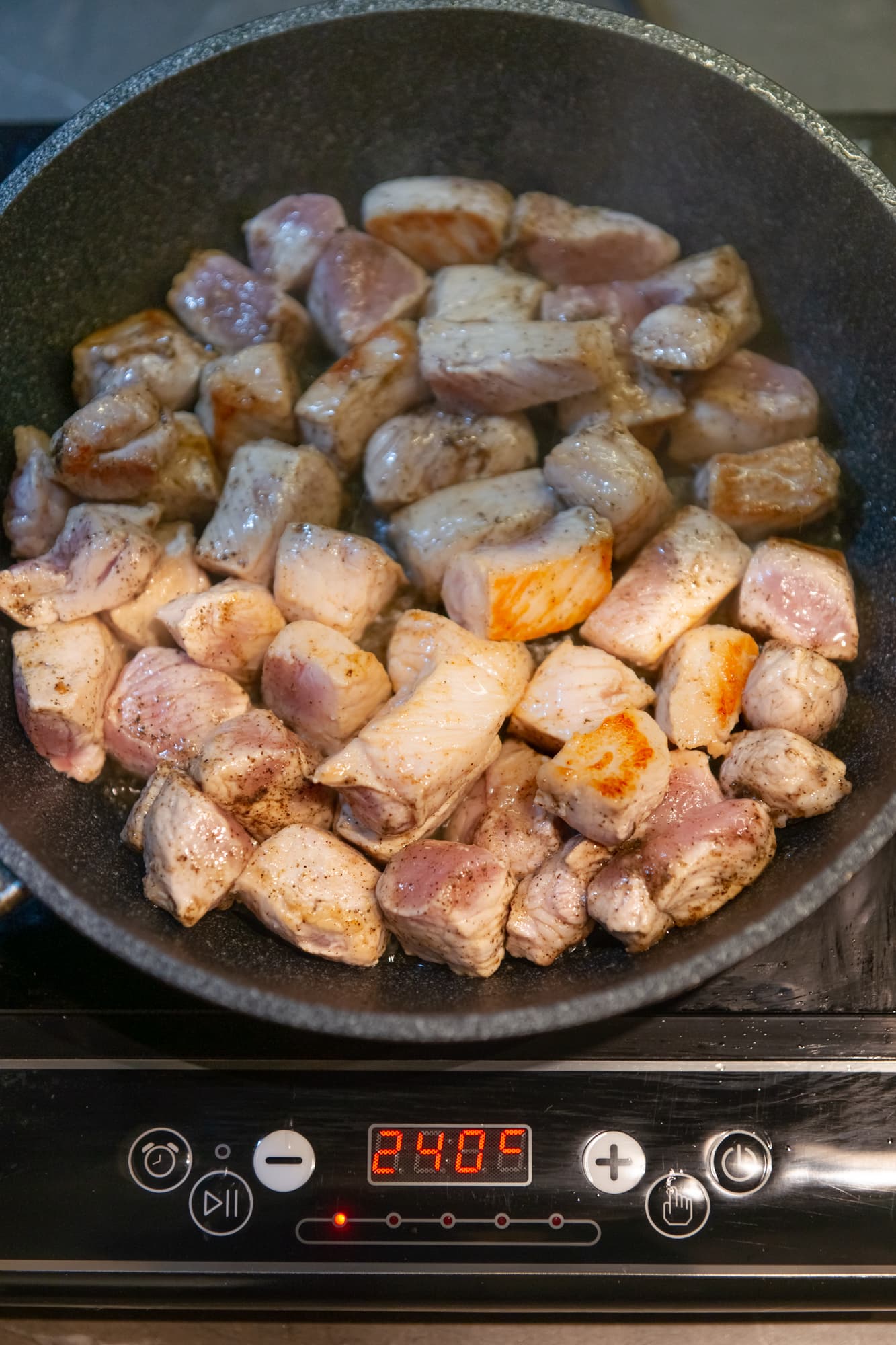 Обжарили мясо на сковороде при максимальных 240 °C.
