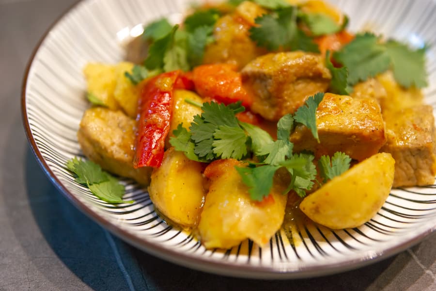 Спустя минут 10 присоединили к ним картошку, перцы, посолили, добавили специй, всё перемешали и влили немного воды. Снова закрыли крышкой и оставили тушиться при 90 °C. Пару раз в процессе перемешали содержимое. Через 25 минут блюдо было готово.