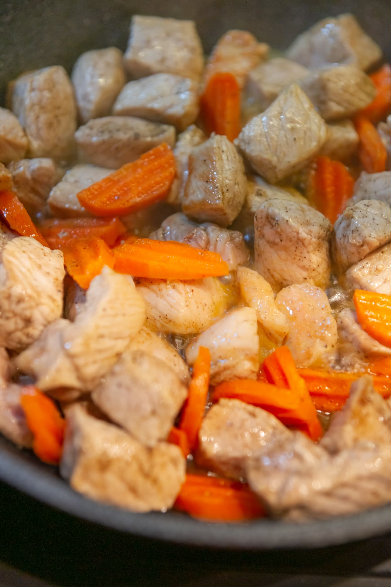 Добавили к нему морковку, затем картошку с болгарским перцем и, чуть убавив нагрев, накрыли крышкой.