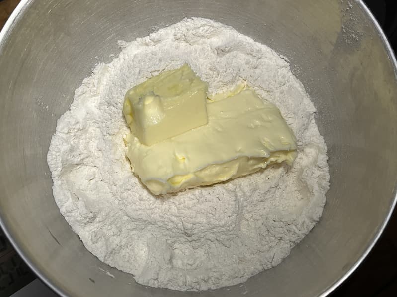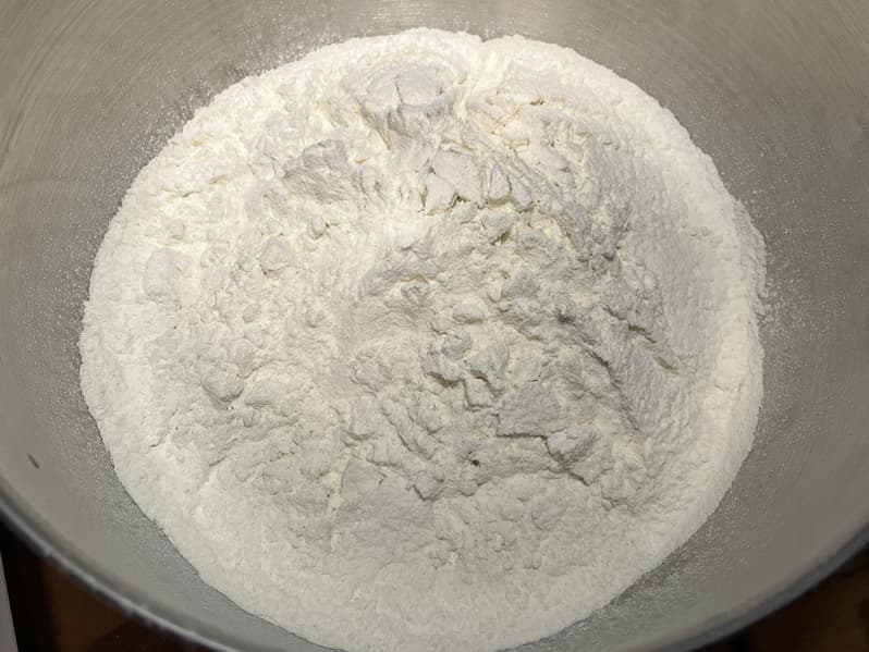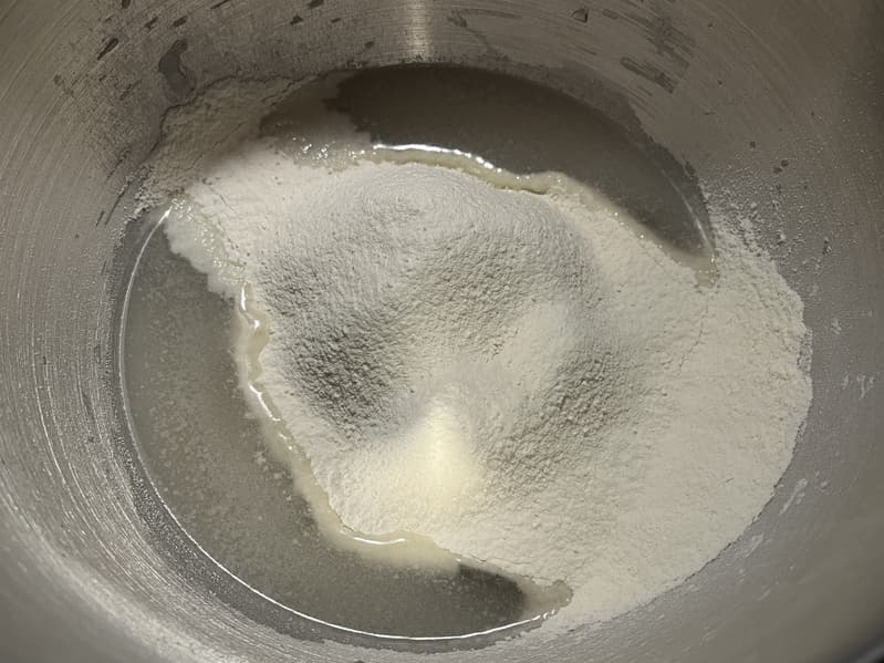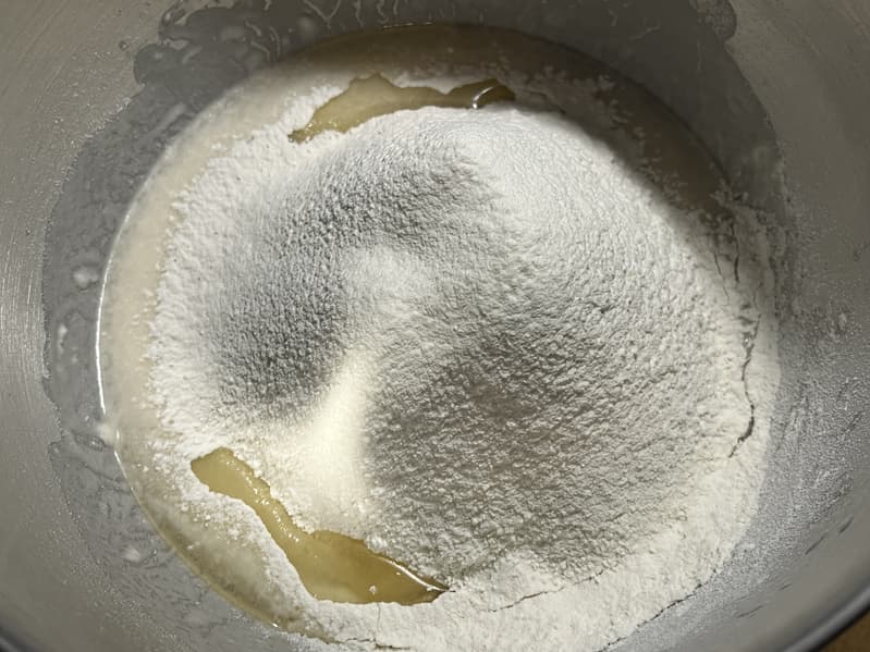 Муку, сахар и масло мы добавили в дежу и включили тестомес на 2-й скорости.
