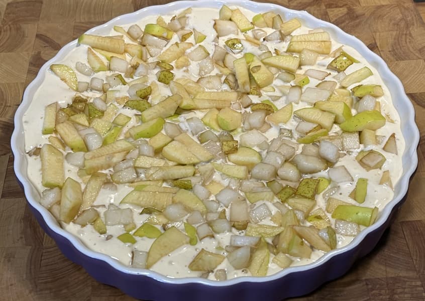 Влили в нее немного теста, затем уложили яблоки и покрыли оставшимся тестом сверху.