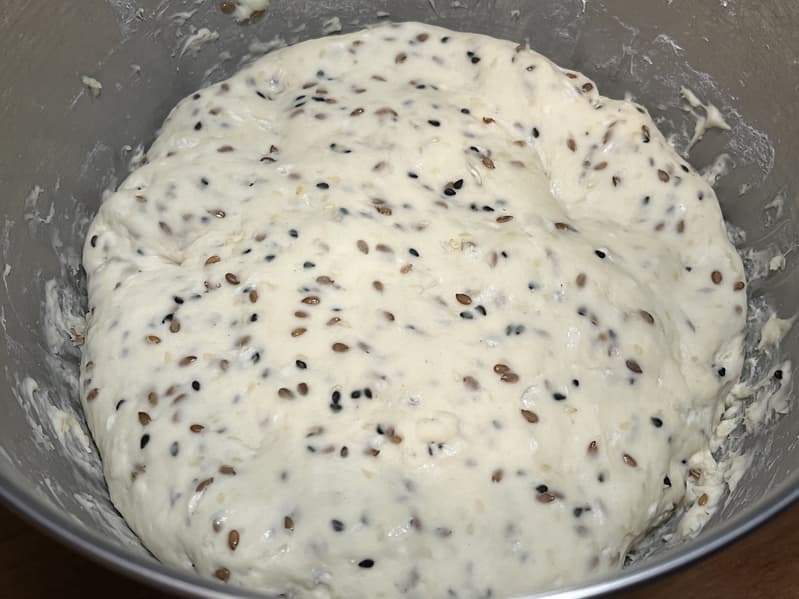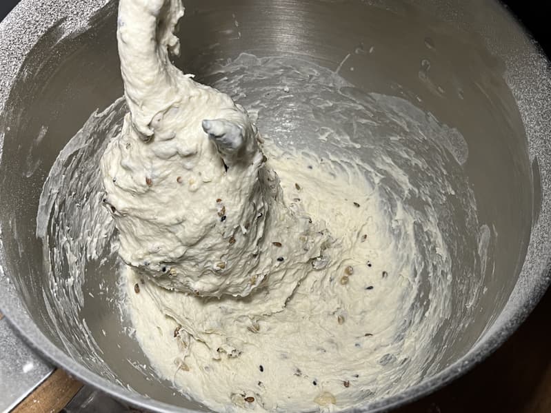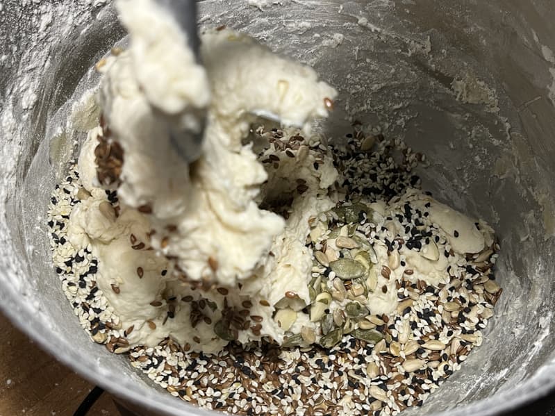 Через 2,5 минуты, когда тесто слегка замешалось, мы добавили к нему семена и отправили вымешиваться дальше.
