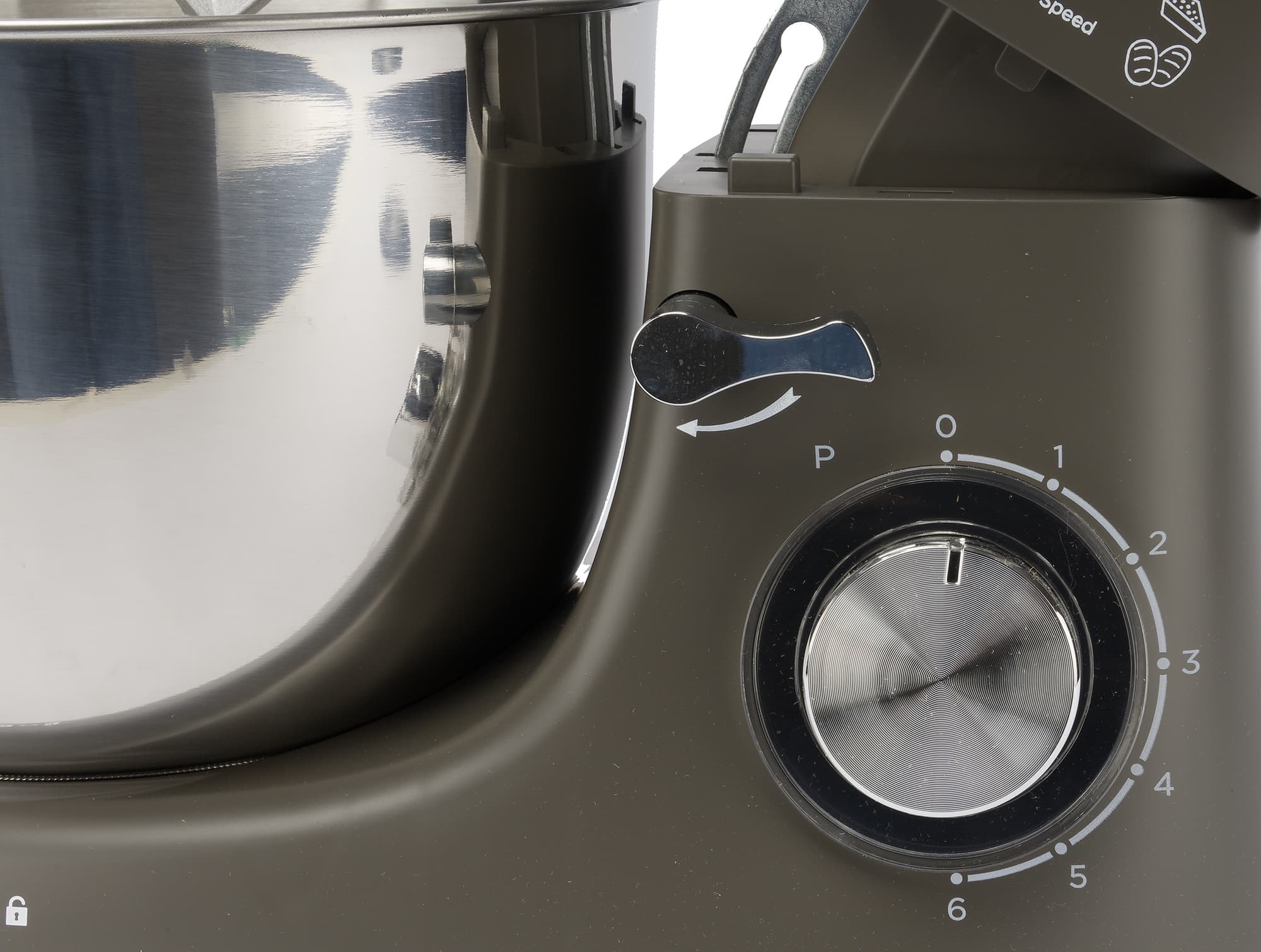 Округлая дежа объемом 4,5 л выполнена из нержавеющей стали и имеет удобную широкую ручку. Ко дну она сужается и на получившейся ступеньке имеются 3 небольших объемных выступа, благодаря которым она крепится посредством байонетного соединения в основании корпуса.